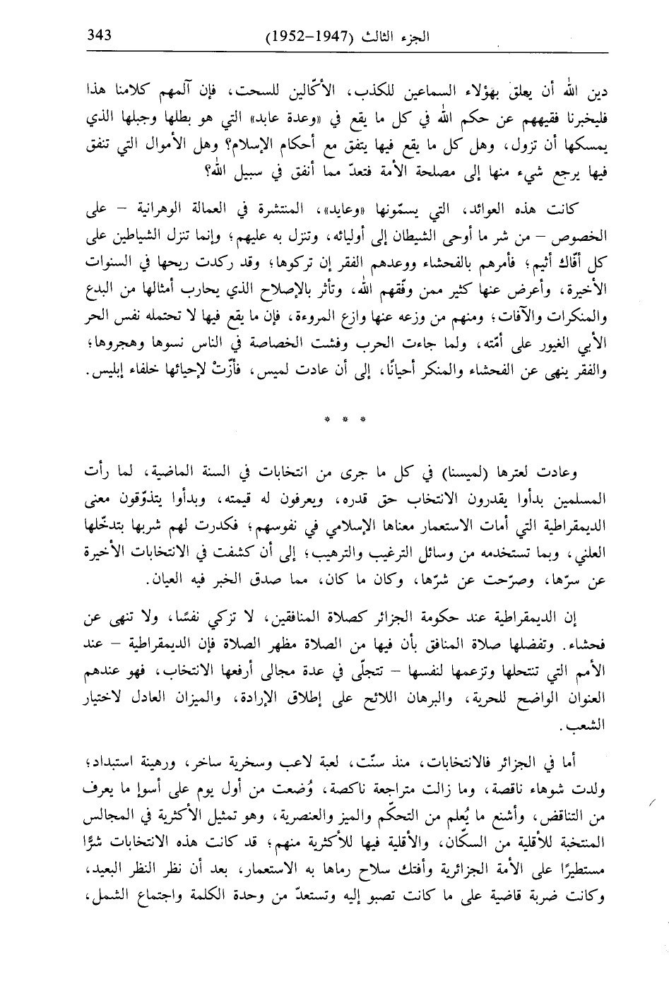 إن الديمقراطية عند حكومة الجزائر كصلاة المنافقين، لا تزكي نفسًا، ولا تنهى عن فحشاء. وتفضلها صلاة المنافق بأن فيها من الصلاة مظهر الصلاة فإن الديمقراطية- عند الأمم التي تنتحلها وتزعمها لنفسها- تتجلّى في عدة مجالى أرفعها الانتخاب، فهو عندهم العنوان الواضح للحرية، والبرهان اللائح على إطلاق الإرادة، والميزان العادل لاختيار الشعب.