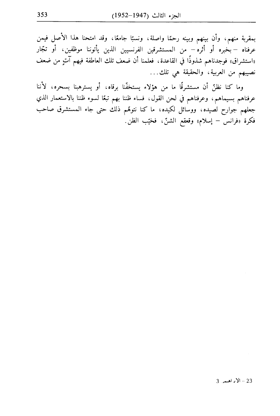 وما كنا نظنّ أن مستشرقًا ما من هؤلاء يستخفّنا برقاه، أو يسترهبنا بسحره، لأننا عرفناهم بسيماهم، وعرفناهم في لحن القول، فساء ظننا بهم تبعًا لسوء ظننا بالاستعمار الذي جعلهم جوارح لصيده، ووسائل لكيده؛ ما كنا نتوهّم ذلك حتى جاء المستشرق صاحب فكرة "فرانس- إسلام" وقعقع الشنّ، فخيّب الظن.