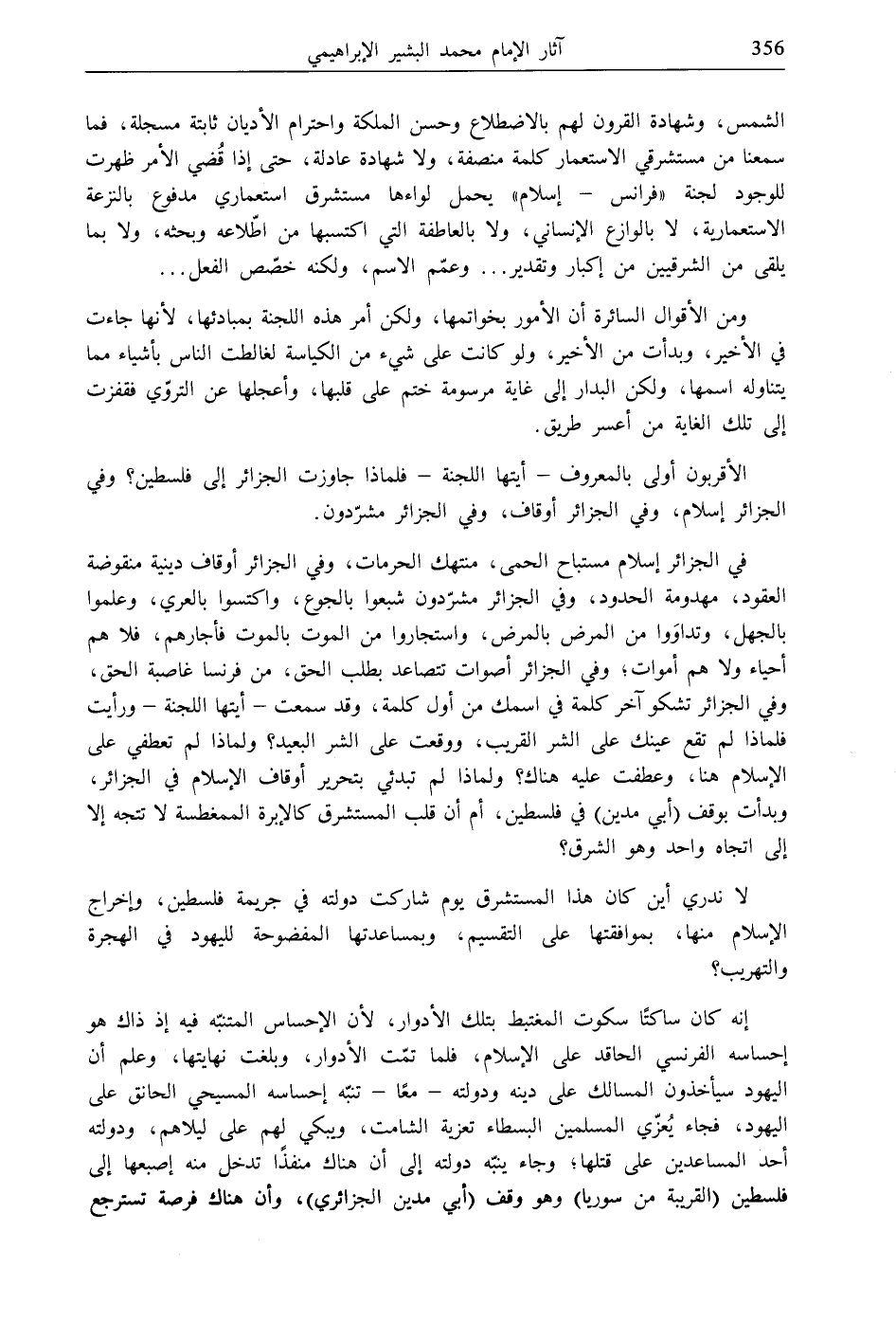 في الجزائر إسلام مستباح الحمى، منتهك الحرمات، وفي الجزائر أوقاف دينية منقوضة العقود، مهدومة الحدود، وفي الجزائر مشرّدون شبعوا بالجوع، واكتسوا بالعري، وعلموا بالجهل، وتداوَوا من المرض بالمرض، واستجاروا من الموت بالموت فأجارهم، فلا هم أحياء ولا هم أموات، وفي الجزائر أصوات تتصاعد بطلب الحق، من فرنسا غاصبة الحق، وفي الجزائر تشكو آخر كلمة في اسمك من أول كلمة، وقد سمعت- أيتها اللجنة- ورأيت فلماذا لم تقع عينك على الشر القريب، ووقعت على الشر البعيد؟ ولماذا لم تعطفي على الإسلام هنا، وعطفت عليه هناك؟ ولماذا لم تبدئي بتحرير أوقاف الإسلام في الجزائر، وبدأت بوقف (أبي مدين) في فلسطين، أم أن قلب المستشرق كالإبرة الممغطسة لا تتجه إلا إلى اتجاه واحد وهو الشرق؟