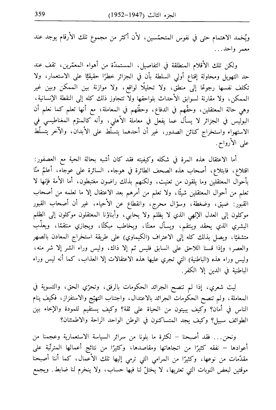 ولكن تلك الأقلام المنطلقة في التفاصيل، المستمدّة من أهواء المعمّرين، تقف عند حد التهويل ومحاولة إقناع أولي السلطة بأن في الجزائر خطرًا حقيقيًا على الاستعمار، ولا تكلف نفسها رجوعًا إلى منطق، ولا تحليلًا لواقع، ولا موازنة بين الممكن وبين غير الممكن، ولا مقارنة لسوابق الأحداث بلواحقها ولا تتجاوز ذلك كله إلى النقطة الإنسانية، وهي حالة المعتقلين، وحقّهم في الدفاع، وحظّهم في المعاملة، مع أنها تعلم كما نعلم أن البوليس في الجزائر لا يسأل عما يفعل في معاملة الأهلي، وأنه كالمنوّم المغناطيسي في الاستهواء واستخراج كنائن الصدور، غير أن أحدهما يتسلّط على الأبدان، والآخر يتسلّط على الأرواح.