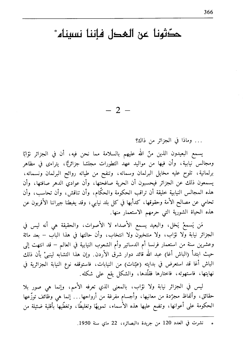 مَن يَسمعْ يَخل، والبعيد يسمع الأصداء لا الأصوات، والحقيقة هي أنه ليس في الجزائر نيابة ولا نوّاب، ولا منتخبون ولا انتخاب، وأن حالتها في هذا الباب- بعد مائة وعشرين سنة من استعمار فرنسا أم الدساتير وأم الشعوب النيابية في العالم- قد انتهت إلى حيث ابتدأ (الباش أغا) عبد الله قائد دوار شرق الأردن. وان هذا التشابه لينبئ بأن ذلك الباش أغا قد استعرض في بدايته (عيّنات) من النيابات، فاستوقفه نوع النيابة الجزائرية في نهايتها، فاستهوته، فاختارها فقلّدها، والشكل يقع على شكله.