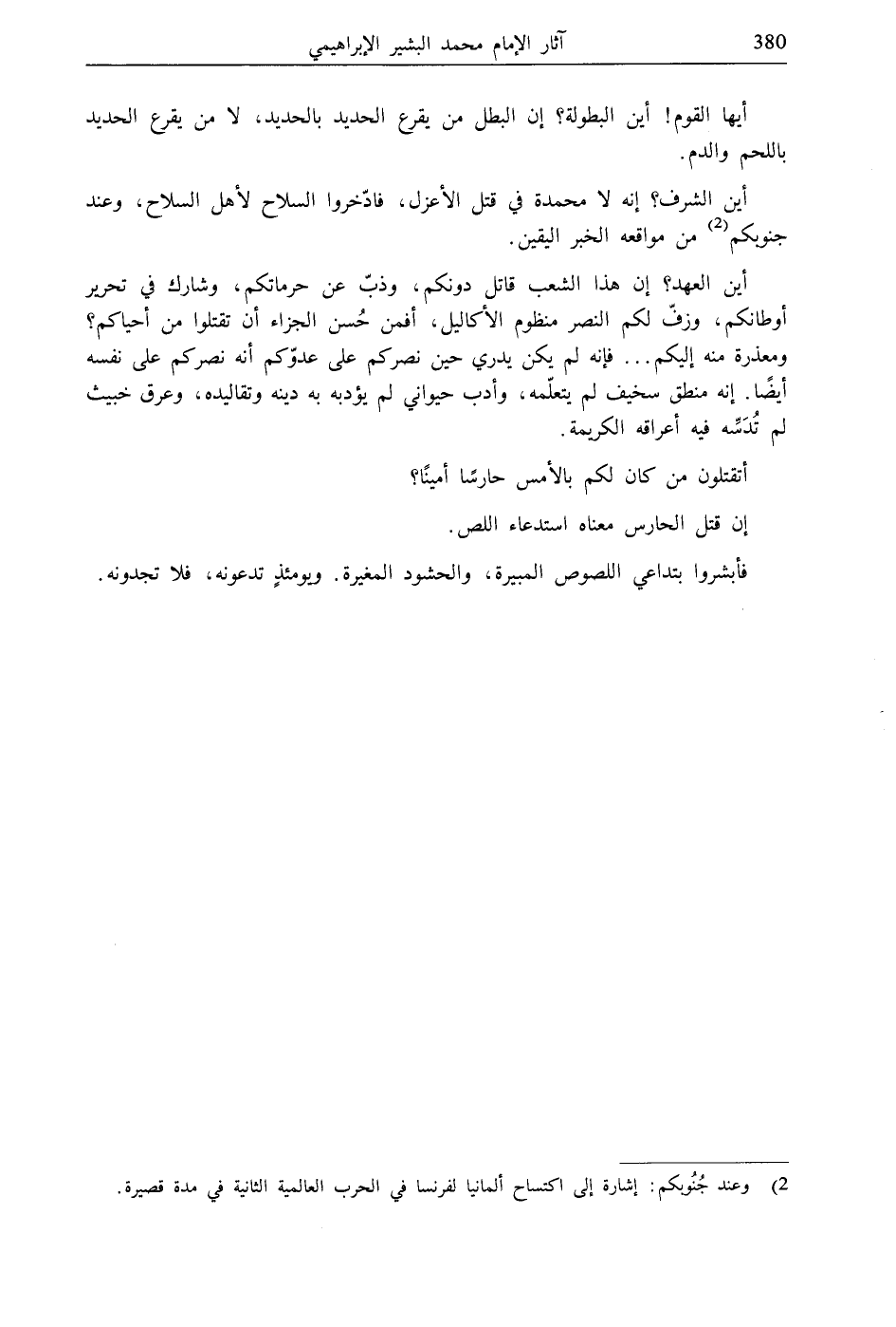 أين الشرف؟ إنه لا محمدة في قتل الأعزل، فادّخروا السلاح لأهل السلاح، وعند جنوبكم (2) من مواقعه الخبر اليقين.
