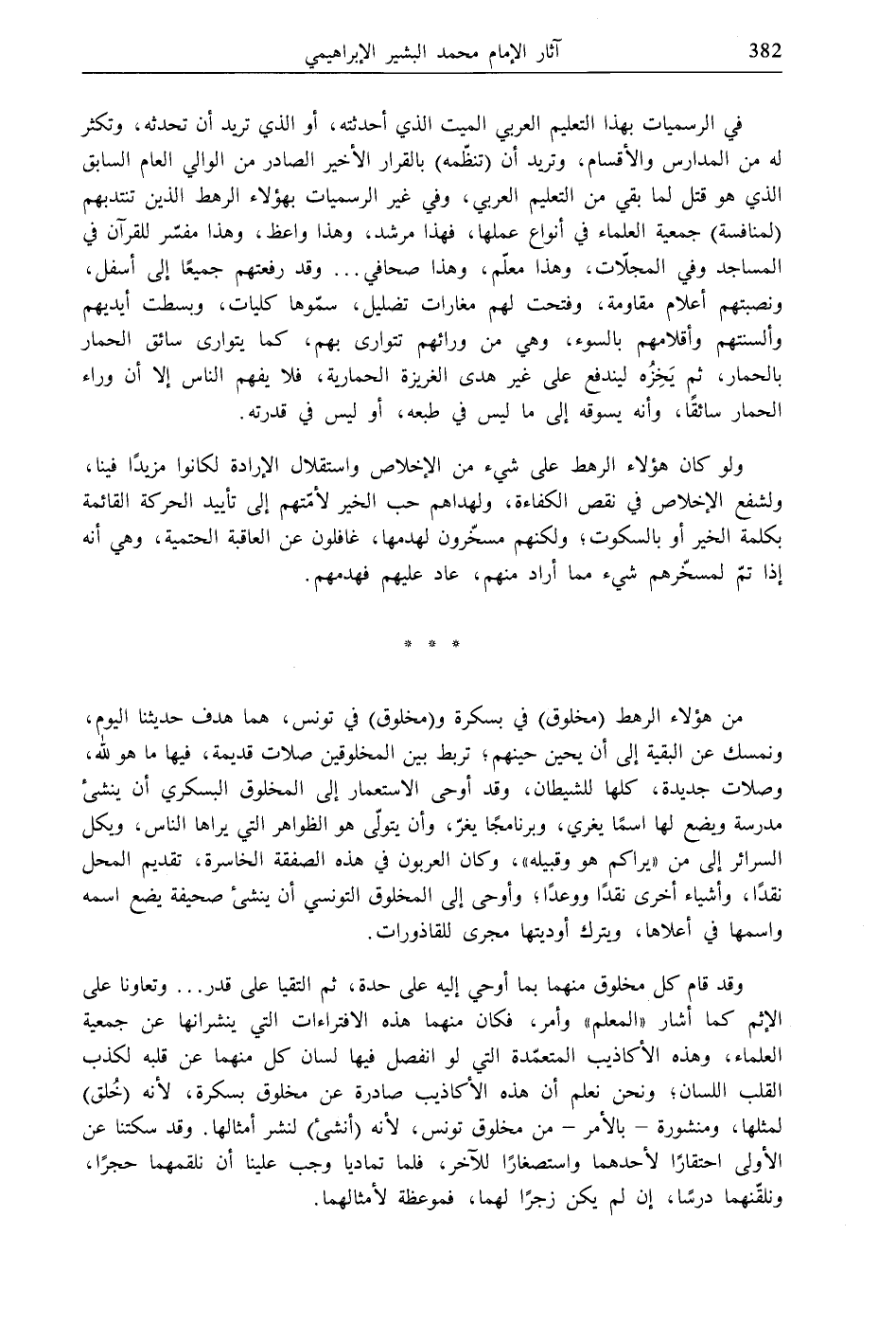 وقد قام كل مخلوق منهما بما أوحي إليه على حدة، ثم التقيا على قدر ... وتعاونا على الإثم كما أشار "المعلم" وأمر، فكان منهما هذه الافتراءات التي ينشرانها عن جمعية العلماء، وهذه الأكاذيب المتعمّدة التي لو انفصل فيها لسان كل منهما عن قلبه لكذب القلب اللسان؛ ونحن نعلم أن هذه الأكاذيب صادرة عن مخلوق بسكرة، لأنه (خُلق) لمثلها، ومنشورة- بالأمر- من مخلوق تونس، لأنه (أنشئ) لنشر أمثالها. وقد سكتنا عن الأولى احتقارًا لأحدهما واستصغارًا للآخر، فلما تماديا وجب علينا أن نلقمهما حجرًا، ونلقّنهما درسًا، إن لم يكن زجرًا لهما، فموعظة لأمثالهما.