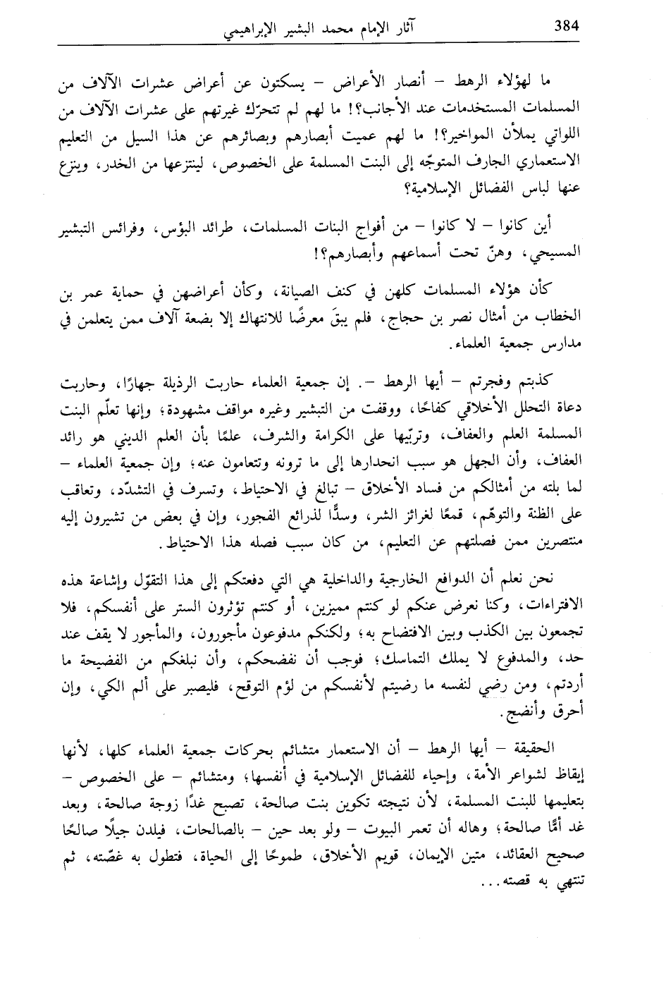كذبتم وفجرتم- أيها الرهط-. إن جمعية العلماء حاربت الرذيلة جهارًا، وحاربت دعاة التحلل الأخلاقي كفاحًا، ووقفت من التبشير وغيره مواقف مشهودة، وإنها تعلّم البنت المسلمة العلم والعفاف، وتربّيها على الكرامة والشرف، علمًا بأن العلم الديني هو رائد العفاف، وأن الجهل هو سبب انحدارها إلى ما ترونه وتتعامون عنه، وإن جمعية العلماء- لما بلته من أمثالكم من فساد الأخلاق- تبالغ في الاحتياط، وتسرف في التشدّد، وتعاقب على الظنة والتوهّم، قمعًا لغرائز الشر، وسدًّا لذرائع الفجور، وإن في بعض من تشيرون إليه منتصرين ممن فصلتهم عن التعليم، من كان سبب فصله هذا الاحتياط.