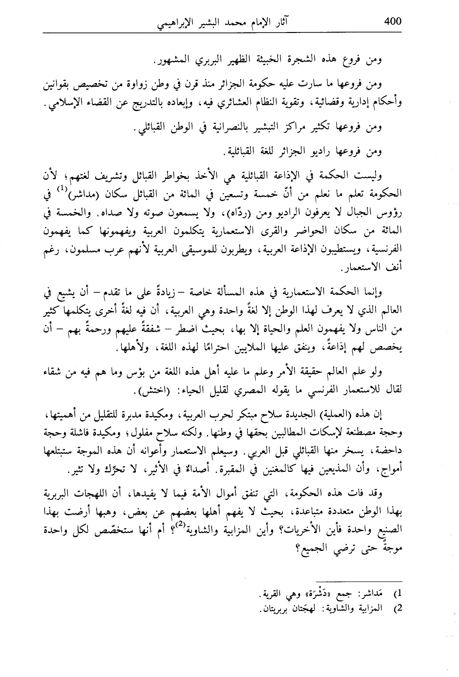 وليست الحكمة في الإذاعة القبائلية هي الأخذ بخواطر القبائل وتشريف لغتهم؛ لأن الحكومة تعلم ما نعلم من أنّ خمسة وتسعين في المائة من القبائل سكان (مداشر) (1) في رؤوس الجبال لا يعرفون الراديو ومن (ردّاه)، ولا يسمعون صوته ولا صداه. والخمسة في المائة من سكان الحواضر والقرى الاستعمارية يتكلمون العربية ويفهمونها كما يفهمون الفرنسية، ويستطيبون الإذاعة العربية، ويطربون للموسيقى العربية لأنهم عرب مسلمون، رغم أنف الاستعمار.