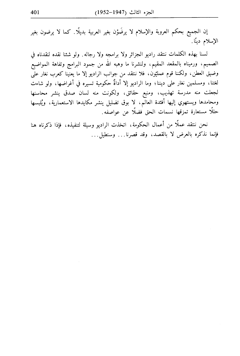 لسنا بهذه الكلمات ننتقد راديو الجزائر ولا برامجه ولا رجاله. ولو شئنا نقده لنقدناه في الصميم، ورميناه بالمقعد المقيم، ولنشرنا ما وهبه الله من جمود البرامج وتفاهة المواضيع وضيق العطن، ولكننا قوم عمليّون، فلا ننتقد من جوانب الراديو إلا ما يعنينا كعرب نغار على لغتنا، ومسلمين نغار على ديننا، وما الراديو إلا أداةٌ حكومية تسيره في أغراضها، ولو شاءت لجعلت منه مدرسة تهذيب، ومنبع حقائق، ولكونت منه لسان صدق ينشر محاسنها ومحامدها ويستهوي إليها أفئدة العالم، لا بوق تضليل ينشر مكايدها الاستعمارية، ويُلبسها حللًا مستعارة تمزقها نسمات الحق فضلًا عن عواصفه.