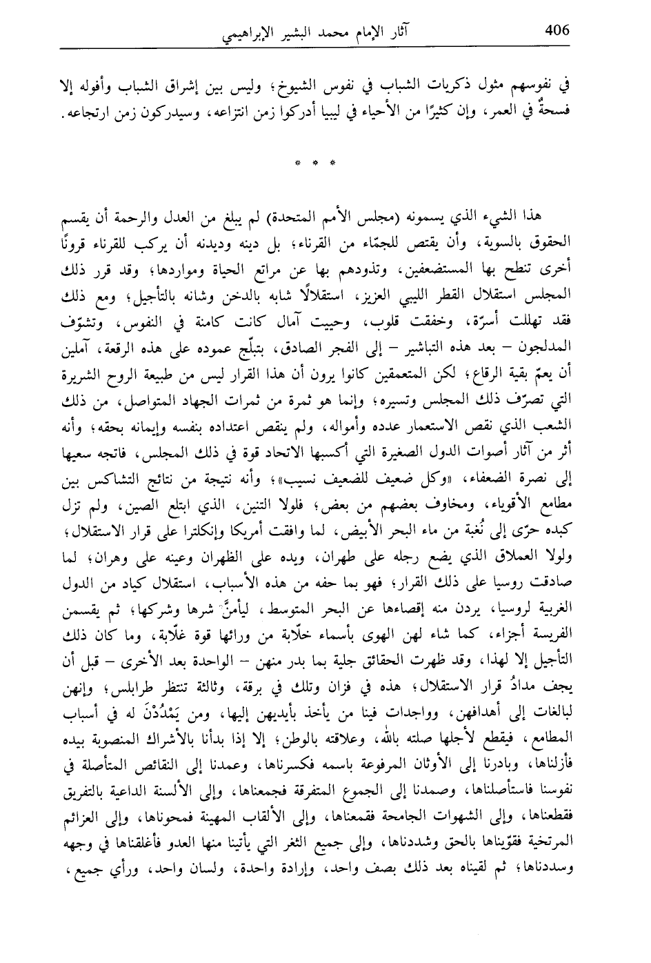 هذا الشيء الذي يسمونه (مجلس الأمم المتحدة) لم يبلغ من العدل والرحمة أن يقسم الحقوق بالسوية، وأن يقتص للجمّاء من القرناء، بل دينه وديدنه أن يركب للقرناء قرونًا أخرى تنطح بها المستضعفين، وتذودهم بها عن مراتع الحياة ومواردها؛ وقد قرر ذلك المجلس استقلال القطر الليبي العزيز، استقلالًا شابه بالدخن وشانه بالتأجيل؛ ومع ذلك فقد تهللت أسرّة، وخفقت قلوب، وحييت آمال كانت كامنة في النفوس، وتشوّف المدلجون- بعد هذه التباشير- إلى الفجر الصادق، بتبلّج عموده على هذه الرقعة، آملين أن يعمّ بقية الرقاع، لكن المتعمقين كانوا يرون أن هذا القرار ليس من طبيعة الروح الشريرة التي تصرّف ذلك المجلس وتسيره؛ وإنما هو ثمرة من ثمرات الجهاد المتواصل، من ذلك الشعب الذي نقص الاستعمار عدده وأمواله، ولم ينقص اعتداده بنفسه وإيمانه بحقه؛ وأنه أثر من آثار أصوات الدول الصغيرة التي أكسبها الاتحاد قوة في ذلك المجلس، فاتجه سعيها إلى نصرة الضعفاء، "وكل ضعيف للضعيف نسيب"، وأنه نتيجة من نتائج التشاكس بين مطامع الأقوياء، ومخاوف بعضهم من بعض، فلولا التنين، الذي ابتلع الصين، ولم تزل كبده حرّى إلى نُغبة من ماء البحر الأبيض، لما وافقت أمريكا وإنكلترا على قرار الاستقلال، ولولا العملاق الذي يضع رجله على طهران، ويده على الظهران وعينه على وهران، لما صادقت روسيا على ذلك القرار، فهو بما حفه من هذه الأسباب، استقلال كياد من الدول الغربية لروسيا، يردن منه إقصاءها عن البحر المتوسط، ليأمنَّ شرها وشركها؛ ثم يقسمن الفريسة أجزاء، كما شاء لهن الهوى بأسماء خلّابة من ورائها قوة غلّابة، وما كان ذلك التأجيل إلا لهذا، وقد ظهرت الحقائق جلية بما بدر منهن- الواحدة بعد الأخرى- قبل أن يجف مدادُ قرار الاستقلال، هذه في فزان وتلك في برقة، وثالثة تنتظر طرابلس؛ وإنهن لبالغات إلى أهدافهن، وواجدات فينا من يأخذ بأيديهن إليها، ومن يَمْدُدْنَ له في أسباب المطامع، فيقطع لأجلها صلته بالله، وعلاقته بالوطن، إلا إذا بدأنا بالأشراك المنصوبة بيده فأزلناها، وبادرنا إلى الأوثان المرفوعة باسمه فكسرناها، وعمدنا إلى النقائص المتأصلة في نفوسنا فاستأصلناها، وصمدنا إلى الجموع المتفرقة فجمعناها، وإلى الألسنة الداعية بالتفريق فقطعناها، وإلى الشهوات الجامحة فقمعناها، وإلى الألقاب المهينة فمحوناها، وإلى العزائم المرتخية فقوّيناها بالحق وشددناها، وإلى جميع الثغر التي يأتينا منها العدو فأغلقناها في وجهه وسددناها، ثم لقيناه بعد ذلك بصف واحد، وإرادة واحدة، ولسان واحد، ورأي جميع،