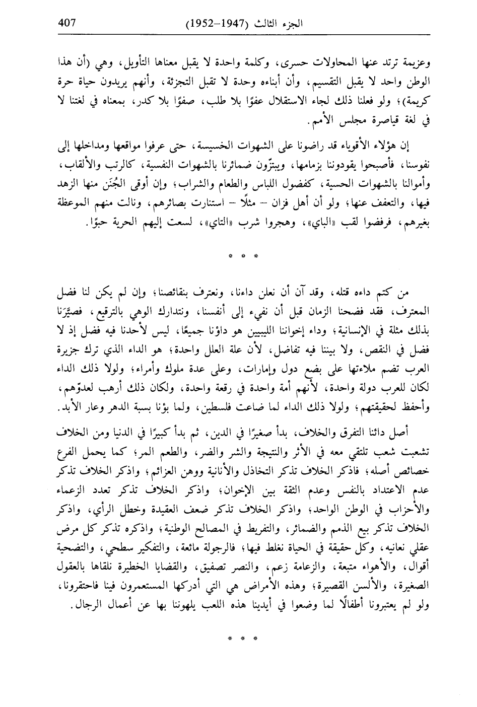 وعزيمة ترتد عنها المحاولات حسرى، وكلمة واحدة لا يقبل معناها التأويل، وهي (أن هذا الوطن واحد لا يقبل التقسيم، وأن أبناءه وحدة لا تقبل التجزئة، وأنهم يريدون حياة حرة كريمة)؛ ولو فعلنا ذلك لجاء الاستقلال عفوًا بلا طلب، صفوًا بلا كدر، بمعناه في لغتنا لا في لغة قياصرة مجلس الأمم.