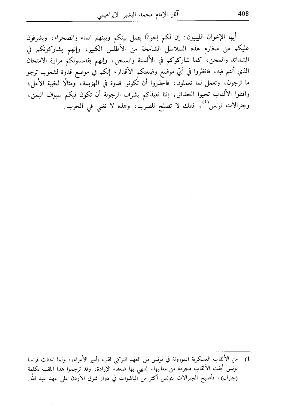 أيها الإخوان الليبيون: إن لكم إخوانًا يصل بينكم وبينهم الماء والصحراء، ويشرفون عليكم من مخارم هذه السلاسل الشامخة من الأطلس الكبير، وإنهم يشاركونكم في الشدائد والمحن، كما شاركوكم في الألسنة والسحن، وإنهم يقاسمونكم مرارة الامتحان الذي أنتم فيه، فانظروا في أيّ موضع وضعتكم الأقدار، إنكم في موضع قدوة لشعوب ترجو ما ترجون، وتعمل لما تعملون، فاحذروا أن تكونوا قدوة في الهزيمة، ومثالًا لخيبة الأمل، واقتلوا الألقاب تحيوا الحقائق؛ إننا نعيذكم بشرف الرجولة أن تكون فيكم سيوف اليمن، وجنرالات تونس (1)، فتلك لا تصلح للضرب، وهذه لا تغني في الحرب.