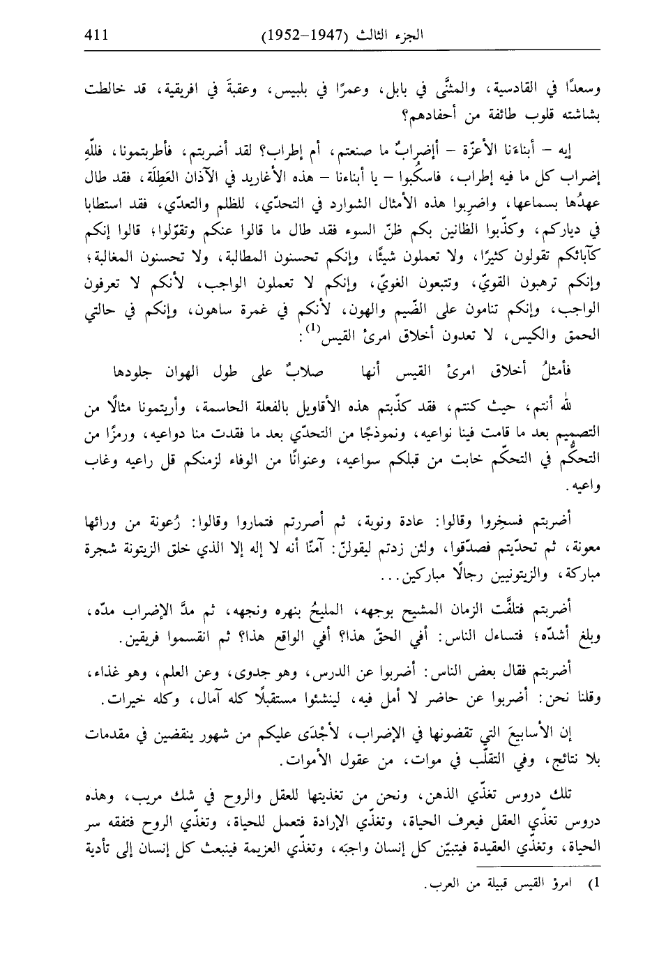 إيه- أبناءَنا الأعزّة- أإضرابٌ ما صنعتم، أم إطراب؟ لقد أضربتم، فأطربتمونا، فللهِ إضراب كل ما فيه إطراب، فاسكُبوا- يا أبناءنا- هذه الأغاريد في الآذان العَطِلَة، فقد طال عهدُها بسماعها، واضرِبوا هذه الأمثال الشوارد في التحدّي، للظلم والتعدّي، فقد استطابا في دياركم، وكذّبوا الظانين بكم ظنّ السوء فقد طال ما قالوا عنكم وتقوّلوا؛ قالوا إنكم كآبائكم تقولون كثيرًا، ولا تعملون شيئًا، هانكم تحسنون المطالبة، ولا تحسنون المغالبة، وإنكم ترهبون القويّ، وتتبعون الغويّ، وإنكم لا تعملون الواجب، لأنكم لا تعرفون الواجب، وإنكم تنامون على الضيم والهون، لأنكم في غمرة ساهون، وإنكم في حالتي الحمق والكيس، لا تعدون أخلاق امرئ اقيس (1):