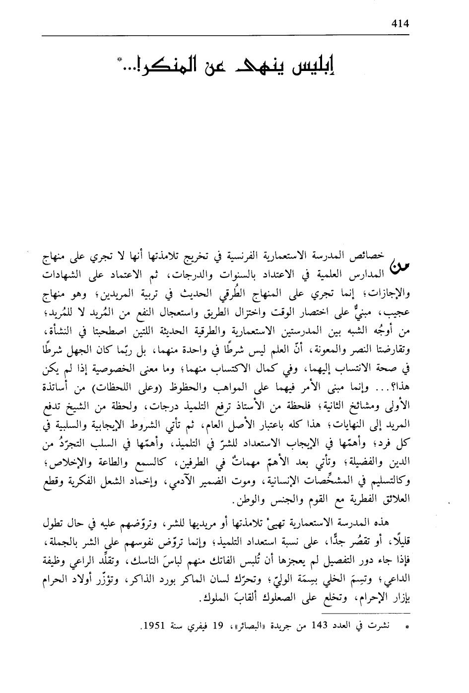 * نشرت في العدد 143 من جريدة «البصائر»، 19 فيفري سنة 1951.
