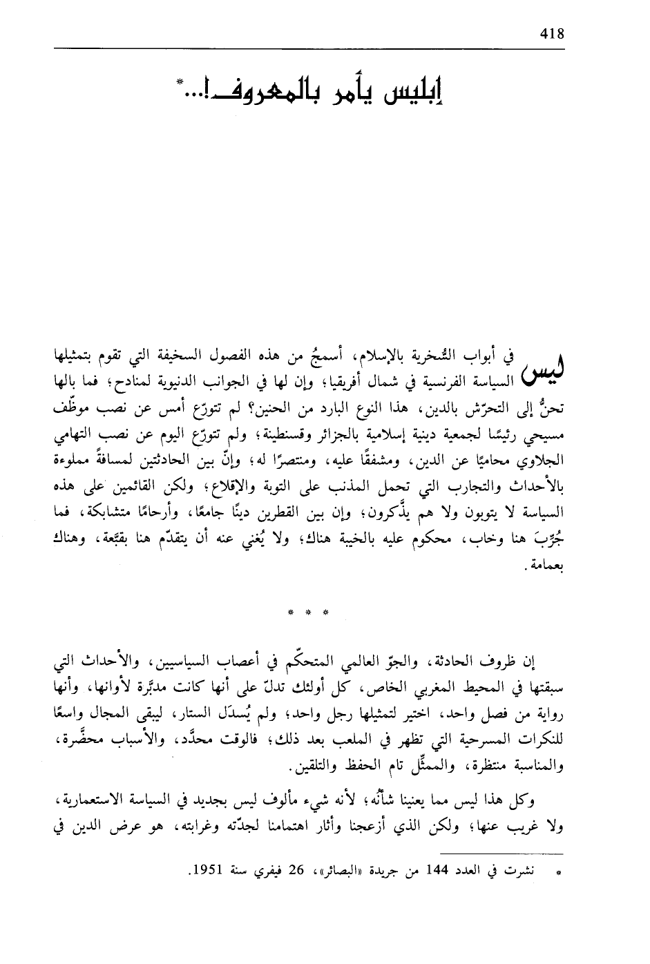 ليس في أبواب السُّخرية بالإسلام، أسمجُ من هذه الفصول السخيفة التي تقوم بتمثيلها السياسة الفرنسية في شمال أفريقيا، وإن لها في الجوانب الدنيوية لمنادح، فما بالها