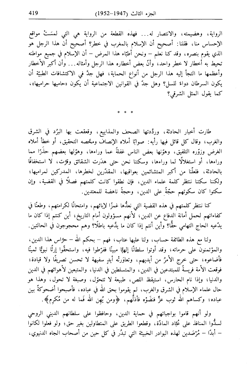 طارت أخبار الحادثة، وردَّدتها الصحف والمذاييع، وقعقعت بها البُرد في الشرق والغرب، وقال كل قائل فيها رأيه: صوابًا أملاه الإنصاف ومحَّصه التحقيق، أو خطأ أملاه الغرض وزوّره التلفيق، وهوّنها بعض الناس غفلةً عما وراءها، وهوّلها بعضهم حذَرًا مما وراءها، أو استغلالًا لما وراءها، وسكتنا نحن حتى هدَرت الشقائق وقرَّت، لا استخفافًا بالحادثة، فلعلّنا من أكبر المتشائمين بعواقبها، المقدّرين لخطرها، المدركين لمراميها، ولكننا سكتنا ننتظر كلمة علماء الدين، فإن نطقوا كانت كلمتهم فصلاً في القضية، وإن سكتوا كان سكوتهم حجّةً على الدين، وحجةً ناهضة للمعتدين.