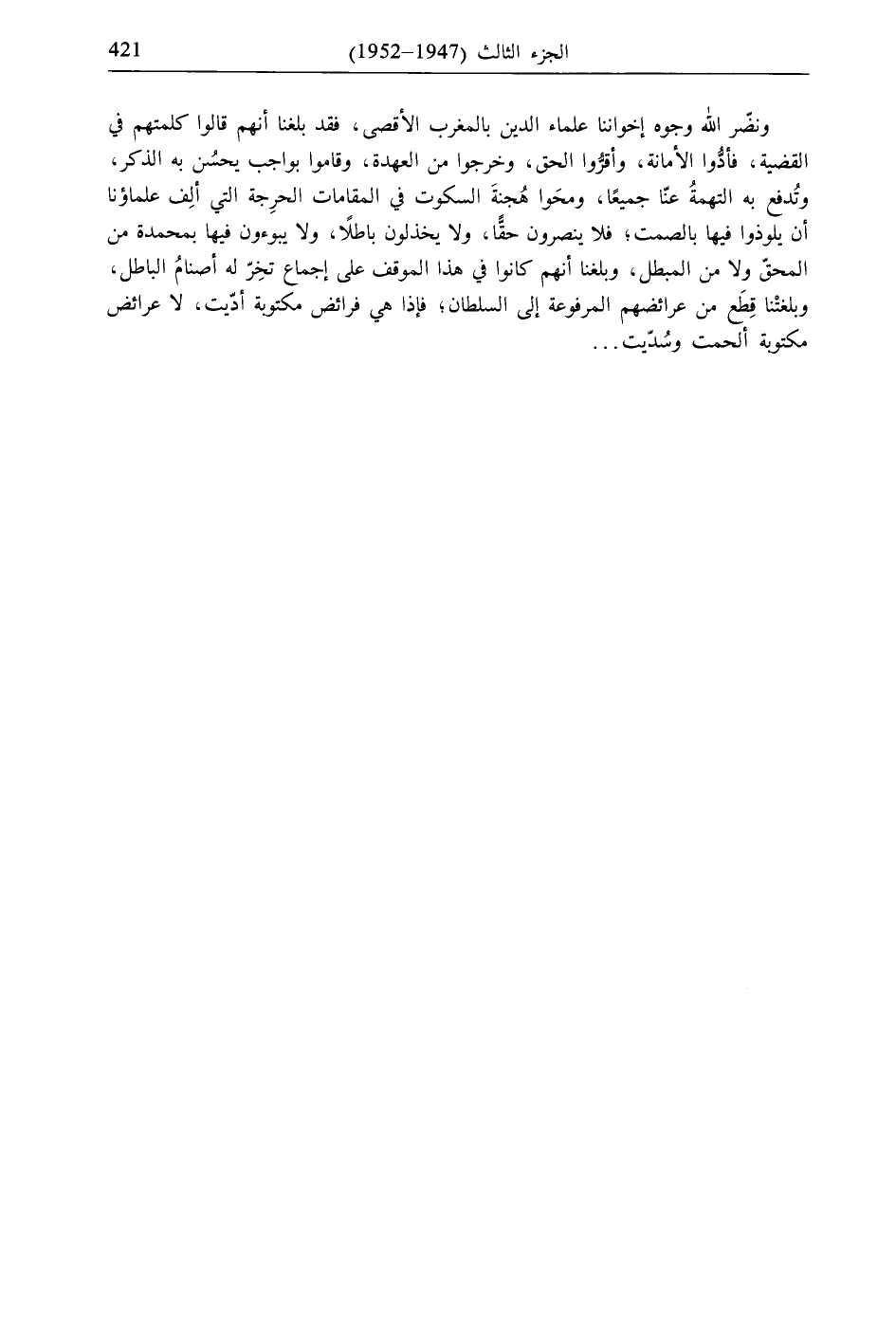 ونضّر الله وجوه إخواننا علماء الدين بالمغرب الأقصى، فقد بلغنا أنهم قالوا كلمتهم في القضية، فأدُّوا الأمانة، وأقرُّوا الحق، وخرجوا من العهدة، وقاموا بواجب يحسُن به الذكر، وتُدفع به التهمةُ عنّا جميعًا، ومحَوا هُجنةَ السكوت في المقامات الحرِجة التي ألِف علماؤنا أن يلوذوا فيها بالصمت، فلا ينصرون حقًّا، ولا يخذلون باطلًا، ولا يبوءون فيها بمحمدة من المحقّ ولا من المبطل، وبلغنا أنهم كانوا في هذا الموقف على إجماع تخِرّ له أصنامُ الباطل، وبلغتْنا قِطَع من عرائضهم المرفوعة إلى السلطان، فإذا هي فرائض مكتوبة أدّيت، لا عرائض مكتوبة ألحمت وسُدّيت ...