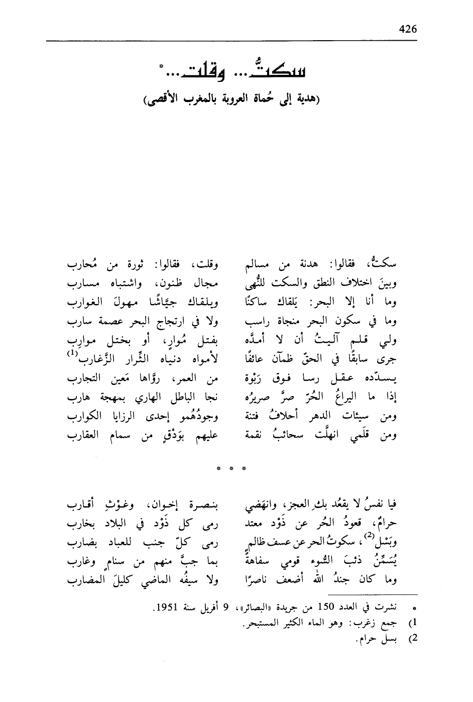 * نشرت في العدد 150 من جريدة «البصائر?»، 9 أفريل سنة 1951.