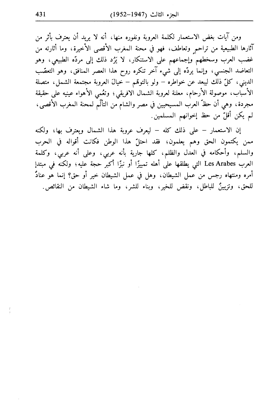 إن الاستعمار- على ذلك كله- ليعرف عروبة هذا الشمال ويعترف بها، ولكنه ممن يكتمون الحق وهم يعلمون، فقد احتلّ هذا الوطن فكانت أقواله في الحرب والسلم، وأحكامه في العدل والظلم، كلها جارية بأنه عربي، وعلى أنه عربي، وكلمة العرب Les Arabes التي يطلقها على أهله تمييزًا أو نبزًا أكبر حجة عليه، ولكنه في مبتدإ أمره ومنتهاه رجس من عمل الشيطان، وهل في عمل الشيطان خير أو حق؟ إنما هو عناد للحق، وتزيينٌ للباطل، ونقض للخير، وبناء للشر، وما شاء الشيطان من النقائص.