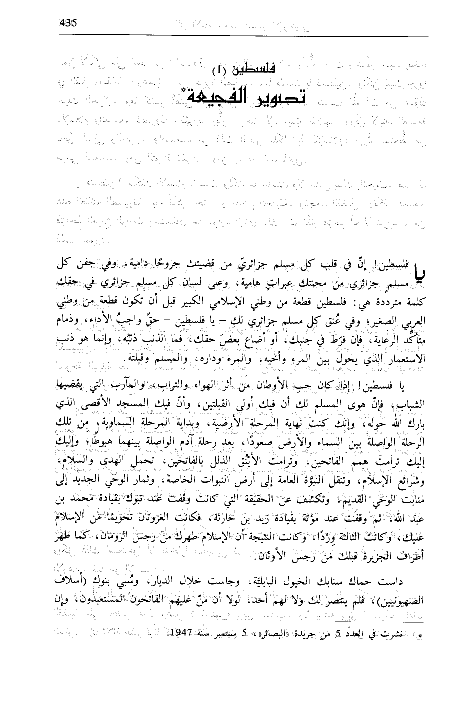 * نشرت في العدد 5 من جريدة «البصائر»، 5 سبتمبر سنة 1947.