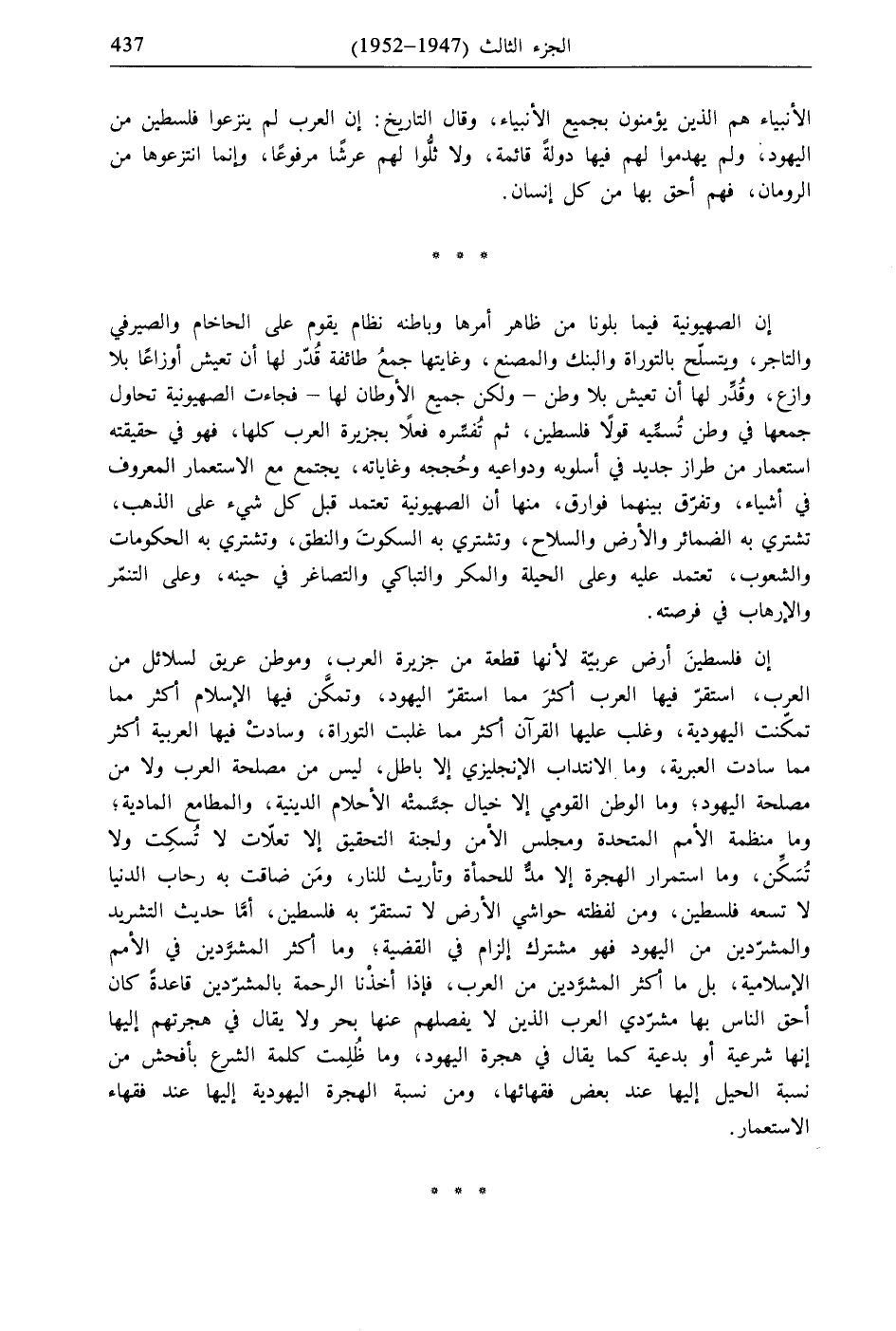 إن فلسطينَ أرض عربيّة لأنها قطعة من جزيرة العرب، وموطن عريق لسلائل من العرب، استقرّ فيها العرب أكثرَ مما استقرّ اليهود، وتمكَّن فيها الإسلام أكثر مما تمكنت اليهودية، وغلب عليها القرآن أكثر مما غلبت التوراة، وسادتْ فيها العربية أكثر مما سادت العبرية، وما الانتداب الإنجليزي إلا باطل، ليس من مصلحة العرب ولا من مصلحة اليهود، وما الوطن القومي إلا خيال جسَّمتْه الأحلام الدينية، والمطامع المادية، وما منظمة الأمم المتحدة ومجلس الأمن ولجنة التحقيق إلا تعلّات لا تُسكِت ولا تُسَكِّن، وما استمرار الهجرة إلا مدٌّ للحمأة وتأريث للنار، ومَن ضاقت به رحاب الدنيا لا تسعه فلسطين، ومن لفظته حواشي الأرض لا تستقرّ به فلسطين، أمَّا حديث التشريد والمشرّدين من اليهود فهو مشترك إلزام في القضية، وما أكثر المشرَّدين في الأمم الإسلامية، بل ما أكثر المشرَّدين من العرب، فإذا أخذْنا الرحمة بالمشرّدين قاعدةً كان أحق الناس بها مشرّدي العرب الذين لا يفصلهم عنها بحر ولا يقال في هجرتهم إليها إنها شرعية أو بدعية كما يقال في هجرة اليهود، وما ظُلِمت كلمة الشرع بأفحش من نسبة الحيل إليها عند بعض فقهائها، ومن نسبة الهجرة اليهودية إليها عند فقهاء الاستعمار.