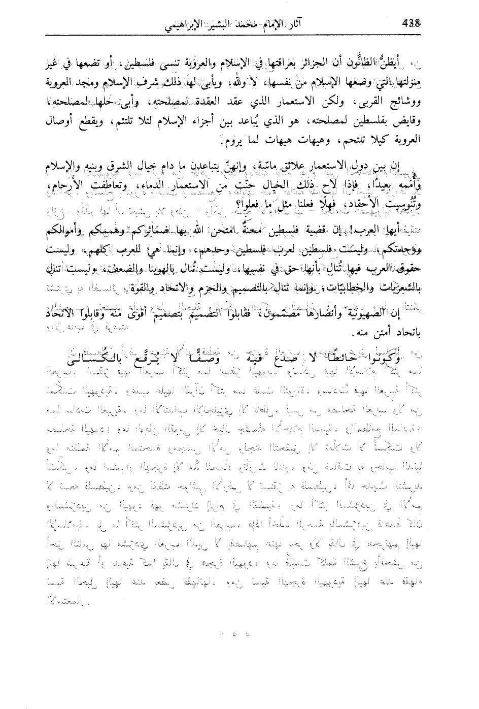 أيظنُّ الظانُّون أن الجزائر بعراقتها في الإسلام والعروبة تنسى فلسطين، أو تضعها فى غير منزلتها التي وضعها الإسلام من نفسها، لا والله، ويأبى لها ذلك شرف الإسلام ومجد العروبة ووشائج القربى، ولكن الاستعمار الذي عقد العقدة لمصلحته، وأبى حلها لمصلحته، وقايض بفلسطين لمصلحته، هو الذي يُباعد بين أجزاء الإسلام لئلا تلتئم، ويقطع أوصال العروبة كيلا تلتحم، وهيهات هيهات لما يروم.