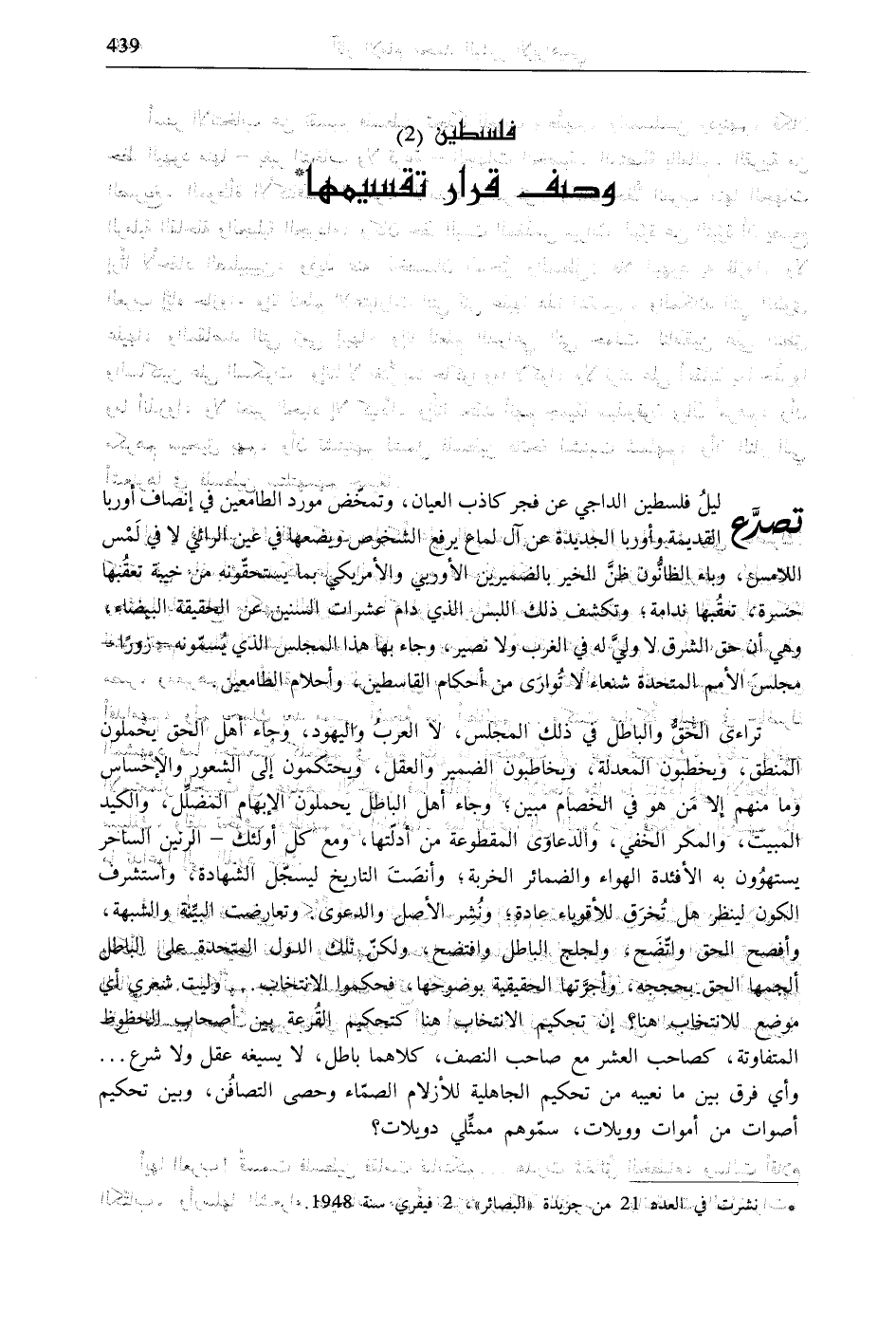 تصدّع ليلُ فلسطين الداجي عن فجر كاذب العيان، وتمخّض مورد الطامعين فى إنصاف أوربا القديمة وأوربا الجديدة عن آل لماع يرفع الشخوص ويضعها في عين الرائي لا في لَمْسَ اللامس، وباء الظانُّون ظنَّ الخير بالضميرين الأوربي والأمريكي بما يستحقّونه من خيبة تعقُبها حسرة، تعقُبها ندامة؛ وتكشف ذلك اللبس الذي دام عشرات السنين عن الحقيقة البيضاء، وهي أن حق الشرق لا وليَّ له في الغرب ولا نصير، وجاء بها هذا المجلس الذي يُسمّونه- زوراً- مجلسَ الأمم المتحدة شنعاء لا تُوارَى من أحكام القاسطين، وأحلام الطامعين.