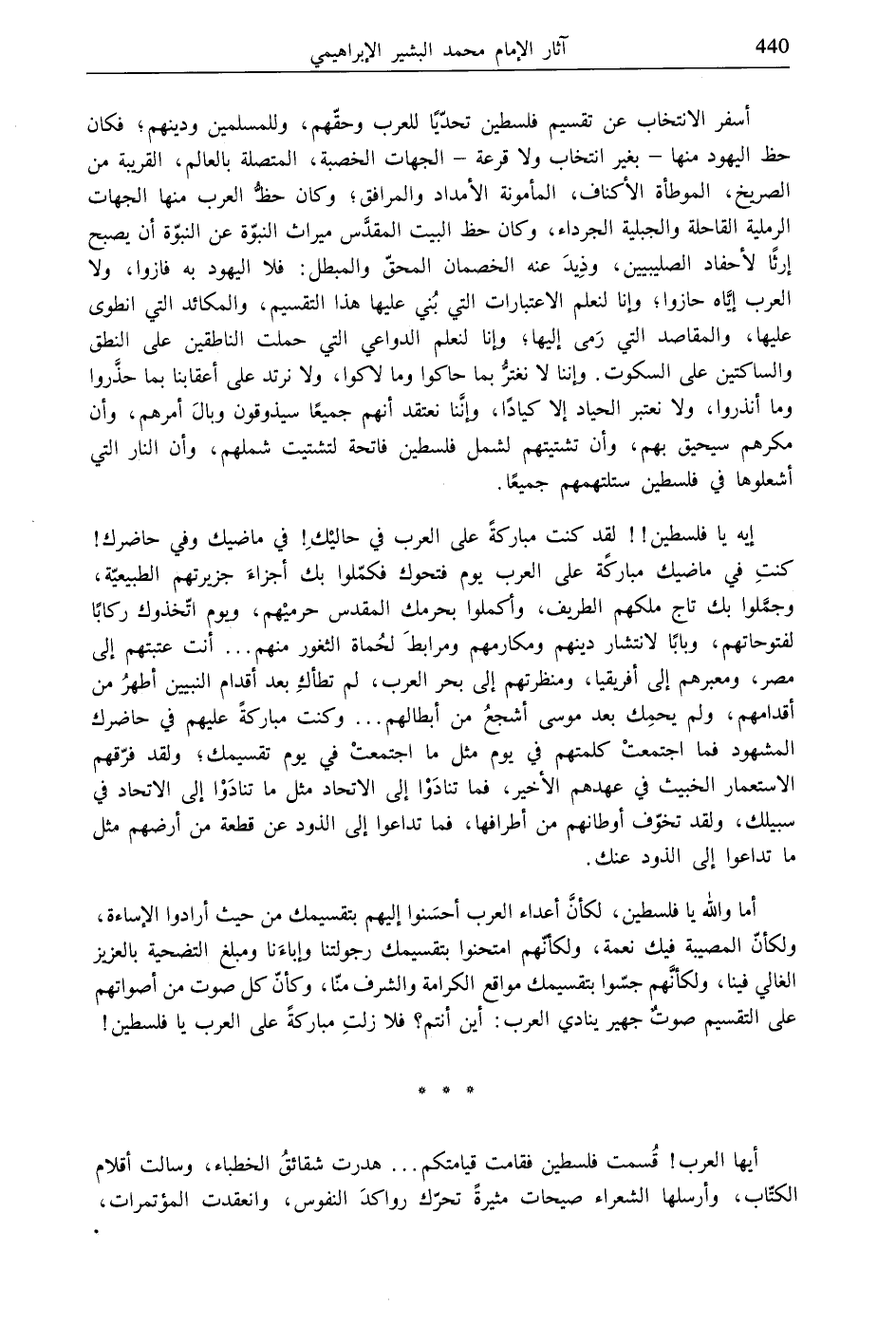 إيه يا فلسطين!! لقد كنت مباركةً على العرب في حاليْكِ! في ماضيك وفي حاضرك! كنتِ في ماضيك مباركةً على العرب يوم فتحوك فكمّلوا بك أجزاءَ جزيرتهم الطبيعيّة، وجمَّلوا بك تاج ملكهم الطريف، وأكملوا بحرمك المقدس حرميْهم، ويوم اتّخذوك ركابًا لفتوحاتهم، وبابًا لانتشار دينهم ومكارمهم ومرابطَ لحُماة الثغور منهم ... أنت عتبتهم إلى مصر، ومعبرهم إلى أفريقيا، ومنظرتهم إلى بحر العرب، لم تطأكِ بعد أقدام النبيين أطهرُ من أقدامهم، ولم يحمِك بعد موسى أشجعُ من أبطالهم ... وكنت مباركةً عليهم في حاضرك المشهود فما اجتمعتْ كلمتهم في يوم مثل ما اجتمعتْ في يوم تقسيمك، ولقد فرّقهم الاستعمار الخبيث في عهدهم الأخير، فما تنادَوْا إلى الاتحاد مثل ما تنادَوْا إلى الاتحاد في سبيلك، ولقد تخوّف أوطانهم من أطرافها، فما تداعوا إلى الذود عن قطعة من أرضهم مثل ما تداعوا إلى الذود عنك.