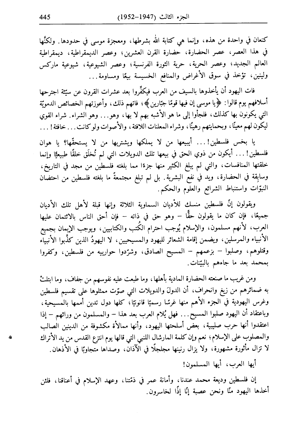 يا بخس فلسطين! ... أيبيعها من لا يملكها ويشتريها من لا يستحقّها؟ يا هوان فلسطين! ... أيكون من ذوي الحق في بيعها تلك الدويلات التي لم تُخلَق خلقًا طبيعيًّا وإنما خلقتها المنافسات، والتي لم يبلغ الكثير منها جزءًا مما بلغته فلسطين من مجد في التاريخ، وسابِقة في الحضارة، ويد في نفع البشرية. بل لم تبلغ مجتمعةً ما بلغته فلسطين من احتضان النبوّات واستنباط الشرائع والعلوم والحكم.