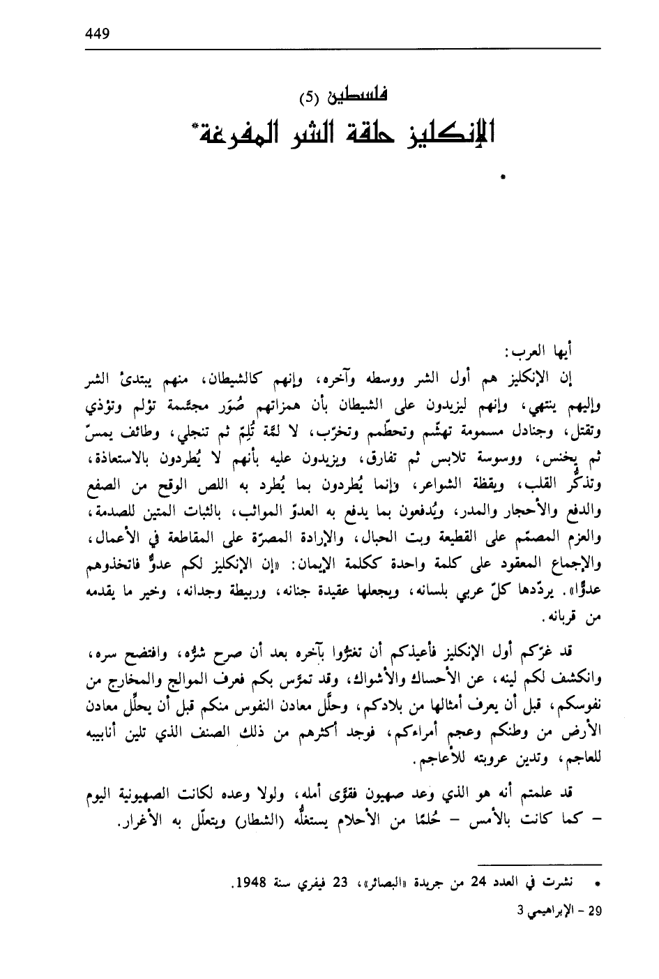إن الإنكليز هم أول الشر ووسطه وآخره، وإنهم كالشيطان، منهم يبتدئ الشر وإليهم ينتهي، وإنهم ليزيدون على الشيطان بأن همزاتهم صُوَر مجسّمة تؤلم وتؤذي وتقتل، وجنادل مسمومة تهشّم وتحطّم وتخرّب، لا لمّة تُلِمّ ثم تنجلي، وطائف يمسّ ثم يخنس، ووسوسة تلابس ثم تفارق، ويزيدون عليه بأنهم لا يُطردون بالاستعاذة، وتذكُّر القلب، ويقظة الشواعر، وإنما يُطردون بما يُطرد به اللص الوقح من الصفع والدفع والأحجار والمدر، ويُدفعون بما يدفع به العدوّ المواثب، بالثبات المتين للصدمة، والعزم المصمّم على القطيعة وبت الحبال، والإرادة المصرّة على المقاطعة في الأعمال، والإجماع المعقود على كلمة واحدة ككلمة الإيمان: "إن الإنكليز لكم عدوٌّ فاتخذوهم عدوًّا". يردّدها كلّ عربي بلسانه، ويجعلها عقيدة جنانه، وربيطة وجدانه، وخير ما يقدمه من قربانه.