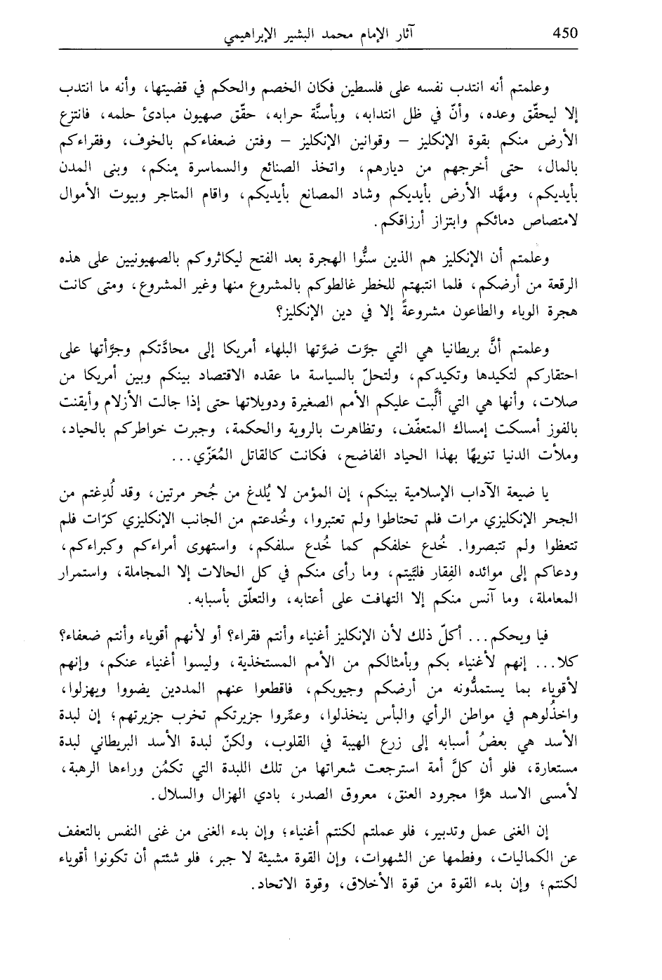 وعلمتم أنه انتدب نفسه على فلسطين فكان الخصم والحكم في قضيتها، وأنه ما انتدب إلا ليحقّق وعده، وأنّ في ظل انتدابه، وبأسنَّة حرابه، حقّق صهيون مبادئ حلمه، فانتزع الأرض منكم بقوة الإنكليز- وقوانين الإنكليز- وفتن ضعفاءكم بالخوف، وفقراءكم بالمال، حتى أخرجهم من ديارهم، واتخذ الصنائع والسماسرة منكم، وبنى المدن بأيديكم، ومهَّد الأرض بأيديكم وشاد المصانع بأيديكم، وأقام المتاجر وبيوت الأموال لامتصاص دمائكم وابتزاز أرزاقكم.