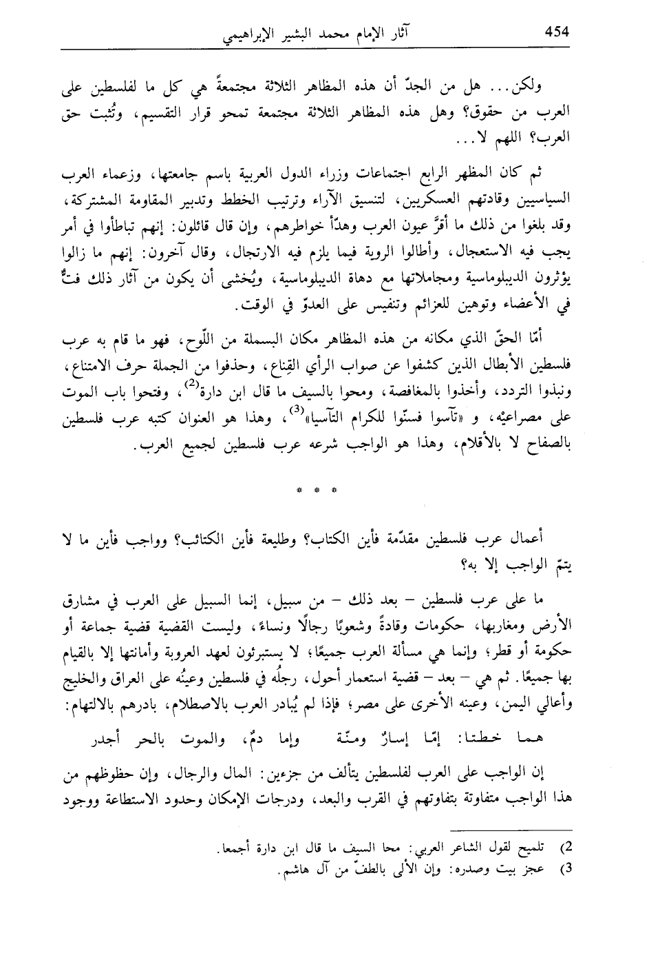 أمّا الحقّ الذي مكانه من هذه المظاهر مكان البسملة من اللّوح، فهو ما قام به عرب فلسطين الأبطال الذين كشفوا عن صواب الرأي القِناع، وحذفوا من الجملة حرف الامتناع، ونبذوا التردد، وأخذوا بالمغافصة، ومحوا بالسيف ما قال ابن دارة (2)، وفتحوا باب الموت على مصراعيْه، و "تآسوا فسنّوا للكرام التآسيا" (3)، وهذا هو العنوان كتبه عرب فلسطين بالصفاح لا بالأقلام، وهذا هو الواجب شرعه عرب فلسطين لجميع العرب.