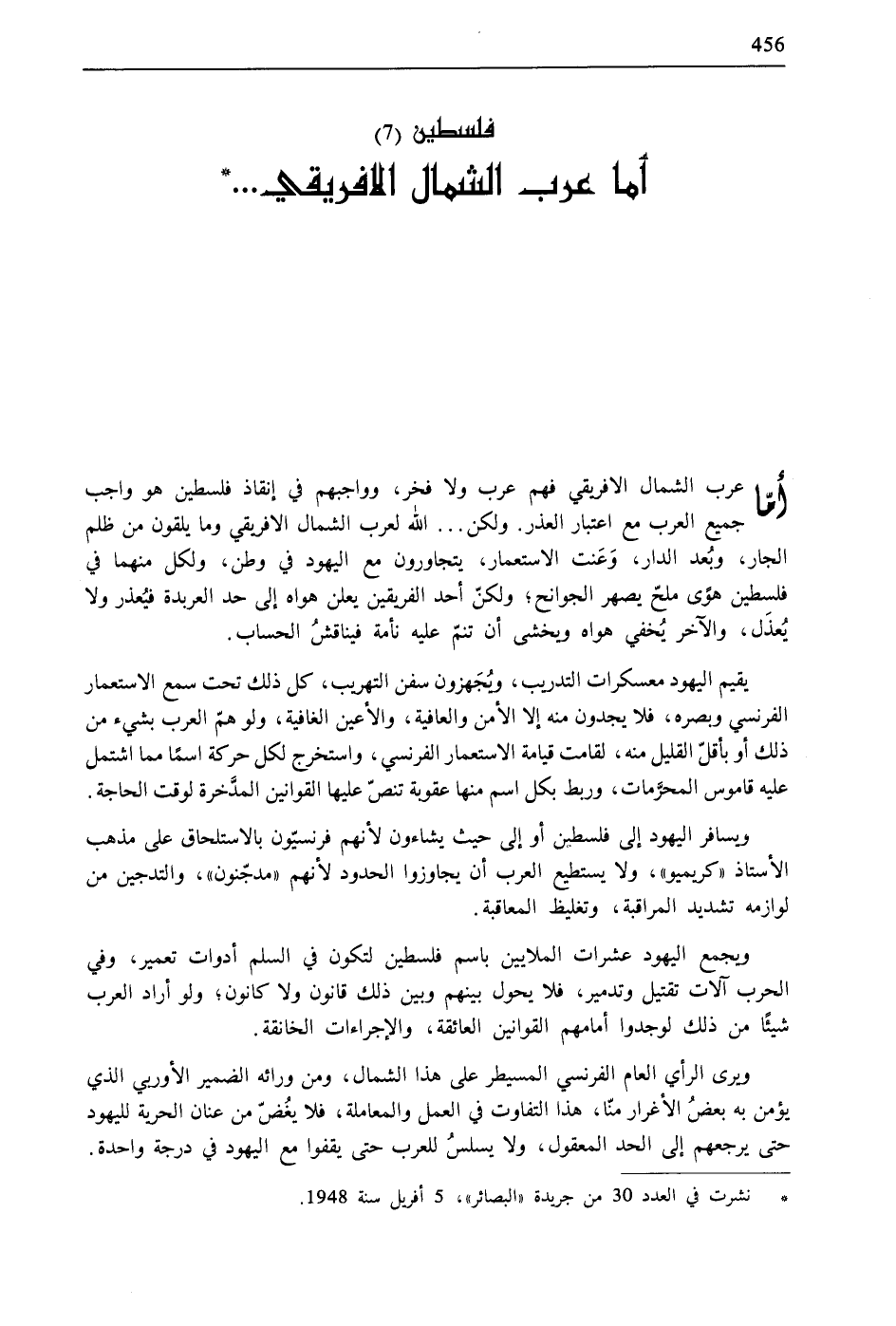 أمّا عرب الشمال الافريقي فهم عرب ولا فخر، وواجبهم في إنقاذ فلسطين هو واجب جميع العرب مع اعتبار العذر. ولكن ... الله لعرب الشمال الافريقي وما يلقون من ظلم الجار، وبعد الدار، وَعَنت الاستعمار، يتجاورون مع اليهود في وطن، ولكل منهما في فلسطين هوًى ملحّ يصهر الجوانح، ولكنّ أحد الفريقين يعلن هواه إلى حد العربدة فيُعذر ولا يُعذَل، والآخر يُخفي هواه ويخشى أن تنمّ عليه نأمة فيناقشُ الحساب.