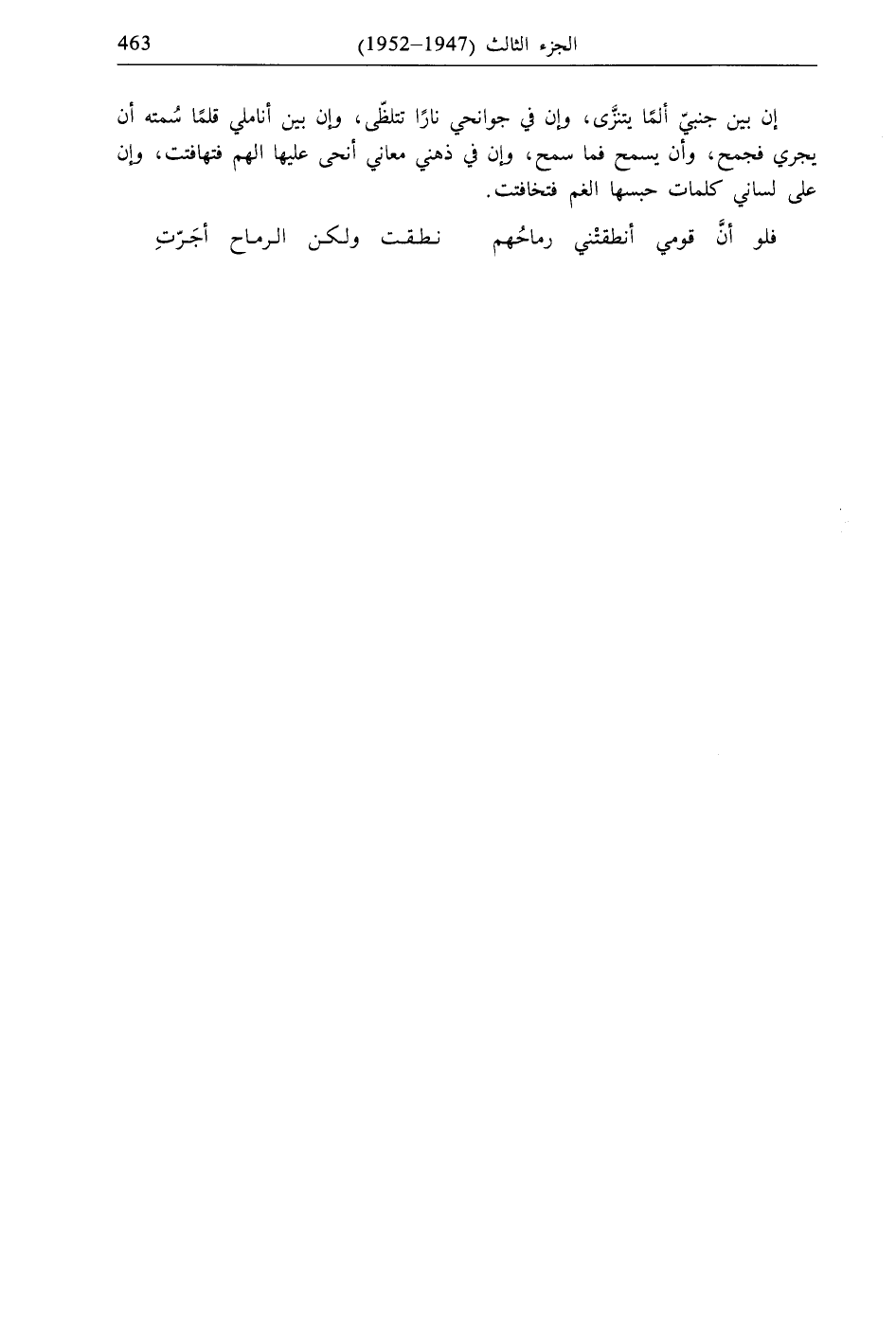 إن بين جنبيّ ألمًا يتنزَّى، وإن في جوانحي نارًا تتلظّى، وإن بين أناملي قلمًا سُمته أن يجري فجمح، وأن يسمح فما سمح، وإن في ذهني معاني أنحى عليها الهم فتهافتت، وإن على لساني كلمات حبسها الغم فتخافتت.