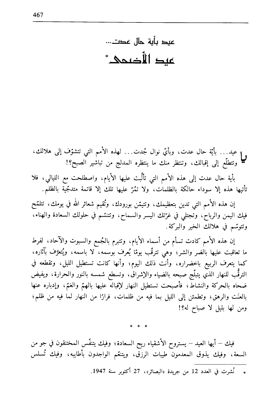 يا عيد ... بأيّة حال عدت، وبأيّ نوال جُدت ... لهذه الأمم التي تتشوّف إلى هلالك، - وتتطلّع إلى إقبالك، وتنتظر منك ما ينتظره المدلج من تباشير الصبح؟!