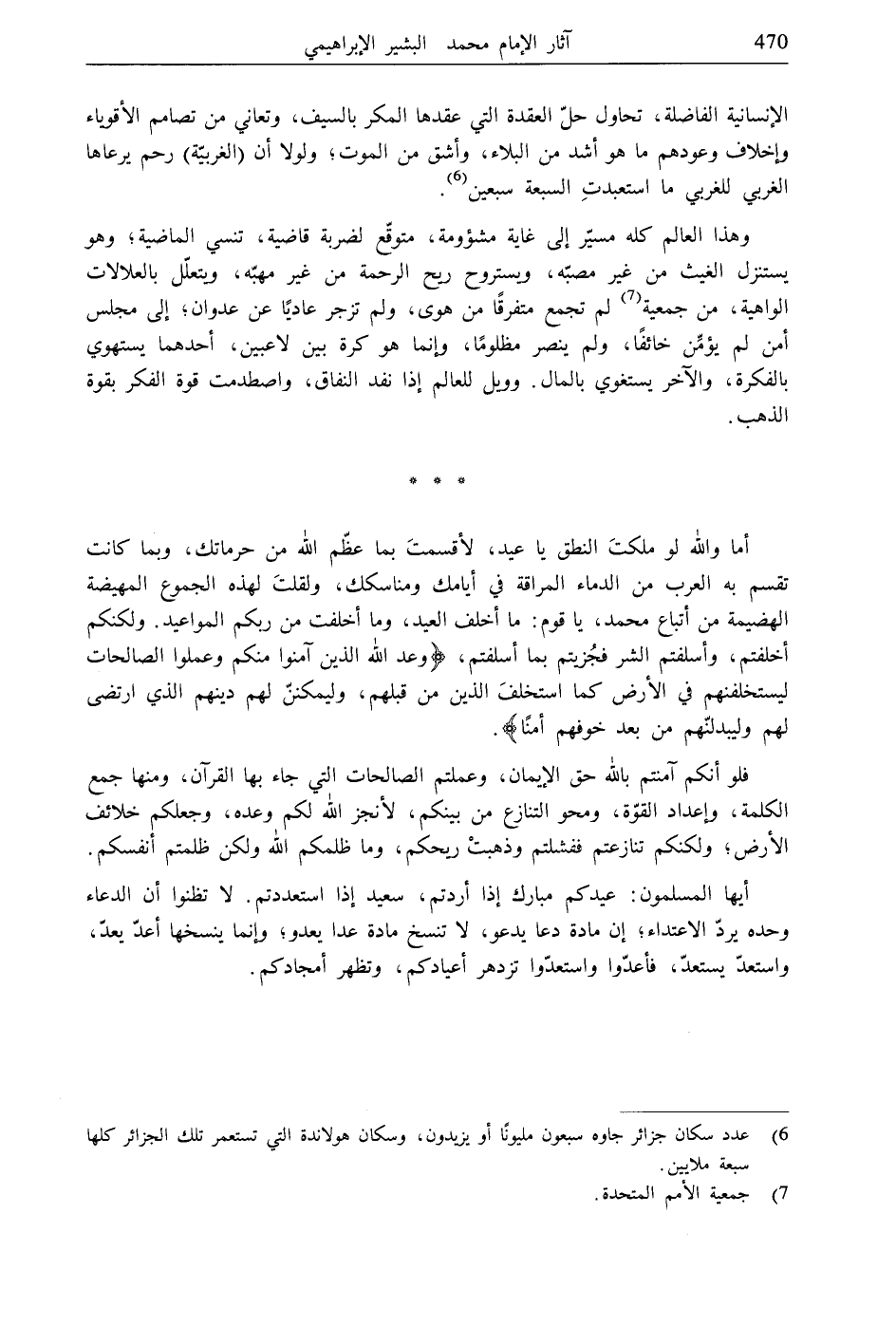 أيها المسلمون: عيدكم مبارك إذا أردتم، سعيد إذا استعددتم. لا تظنوا أن الدعاء وحده يردّ الاعتداء، إن مادة دعا يدعو، لا تنسخ مادة عدا يعدو؛ وإنما ينسخها أعدّ يعدّ، واستعدّ يستعدّ، فأعدّوا واستعدّوا تزدهر أعيادكم، وتظهر أمجادكم.