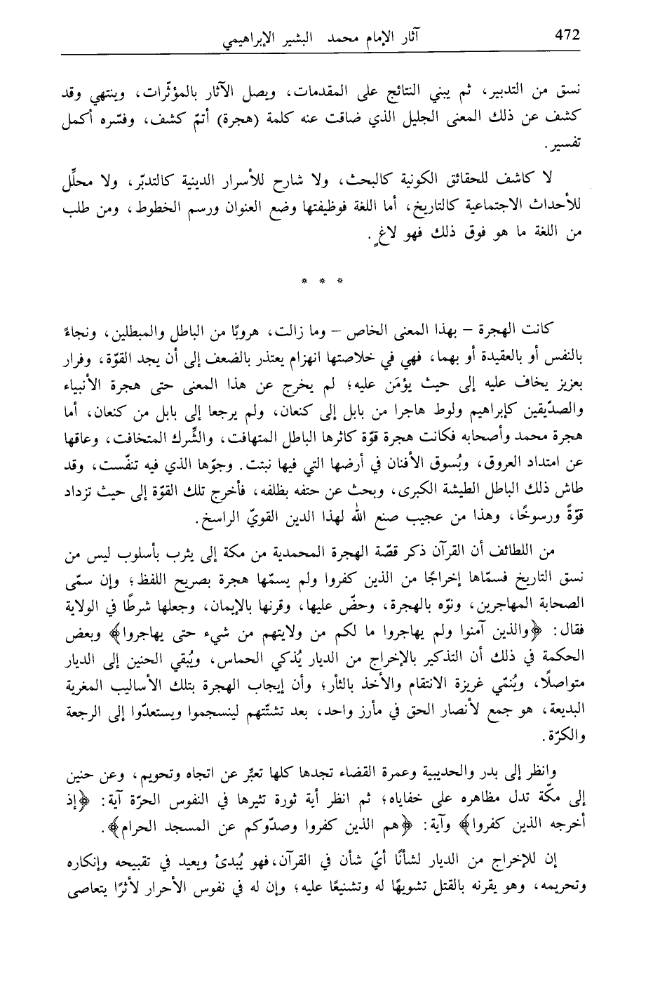 نسق من التدبير، ثم يبني النتائج على المقدمات، ويصل الآثار بالمؤثّرات، وينتهي وقد كشف عن ذلك المعنى الجليل الذي ضاقت عنه كلمة (هجرة) أتمّ كشف، وفسّره أكمل تفسير.