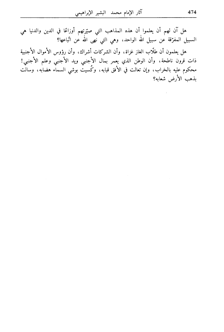 هل يعلمون أن طلّاب الغاز غزاة، وأن الشركات أشراك، وأن رؤوس الأموال الأجنبية ذات قرون ناطحة، وأن الوطن الذي يعمر بمال الأجنبي ويد الأجنبي وعلم الأجنبي! محكوم عليه بالخراب، وإن تعالت في الأفق قبابه، وكُسيت بوشي السماء هضابه، وسالت بذهب الأرض شعابه؟