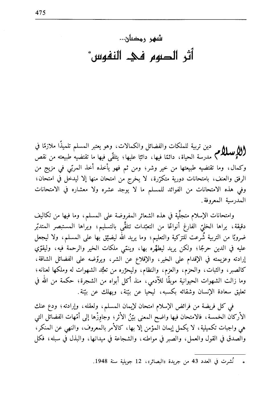 * نُشرت في العدد 43 من جريدة «البصائر»، 12 جويلية سنة 1948.