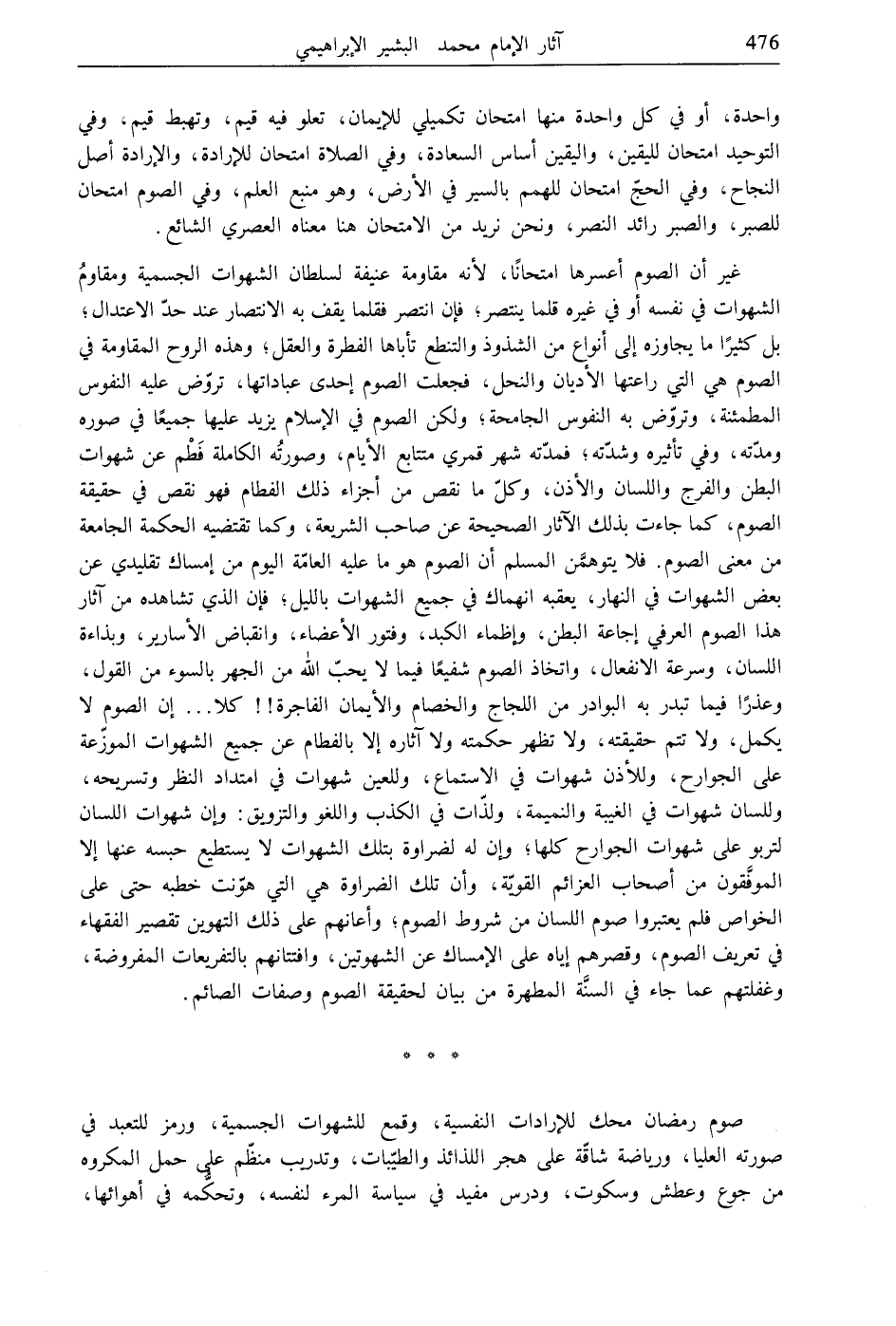 غير أن الصوم أعسرها امتحانًا، لأنه مقاومة عنيفة لسلطان الشهوات الجسمية ومقاومُ الشهوات في نفسه أو في غيره قلما ينتصر، فإن انتصر فقلما يقف به الانتصار عند حدّ الاعتدال، بل كثيرًا ما يجاوزه إلى أنواع من الشذوذ والتنطع تأباها الفطرة والعقل، وهذه الروح المقاومة في الصوم هي التي راعتها الأديان والنحل، فجعلت الصوم إحدى عباداتها، تروّض عليه النفوس المطمئنة، وتروّض به النفوس الجامحة؛ ولكن الصوم في الإسلام يزيد عليها جميعًا في صوره ومدّته، وفي تأثيره وشدّته، فمدّته شهر قمري متتابع الأيام، وصورتُه الكاملة فَطْم عن شهوات البطن والفرج واللسان والأذن، وكلّ ما نقص من أجزاء ذلك الفطام فهو نقص في حقيقة الصوم، كما جاءت بذلك الآثار الصحيحة عن صاحب الشريعة، وكما تقتضيه الحكمة الجامعة من معنى الصوم. فلا يتوهمنَّ المسلم أن الصوم هو ما عليه العامّة اليوم من إمساك تقليدي عن بعض الشهوات في النهار، يعقبه انهماك في جميع الشهوات بالليل، فإن الذي تشاهده من آثار هذا الصوم العرفي إجاعة البطن، وإظماء الكبد، وفتور الأعضاء، وانقباض الأسارير، وبذاءة اللسان، وسرعة الانفعال، واتخاذ الصوم شفيعًا فيما لا يحبّ الله من الجهر بالسوء من القول، وعذرًا فيما تبدر به البوادر من اللجاج والخصام والأيمان الفاجرة!! كلا ... إن الصوم لا يكمل، ولا تتم حقيقته، ولا تظهر حكمته ولا آثاره إلا بالفطام عن جميع الشهوات الموزّعة على الجوارح، وللأذن شهوات في الاستماع، وللعين شهوات في امتداد النظر وتسريحه، وللسان شهوات في الغيبة والنميمة، ولذّات في الكذب واللغو والتزويق: وإن شهوات اللسان لتربو على شهوات الجوارح كلها، وإن له لضراوة بتلك الشهوات لا يستطيع حبسه عنها إلا الموفَّقون من أصحاب العزائم القويّة، وأن تلك الضراوة هي التي هوّنت خطبه حتى على الخواص فلم يعتبروا صوم اللسان من شروط الصوم؛ وأعانهم على ذلك التهوين تقصير الفقهاء في تعريف الصوم، وقصرهم إياه على الإمساك عن الشهوتين، وافتتانهم بالتفريعات المفروضة، وغفلتهم عما جاء في السنَّة المطهرة من بيان لحقيقة الصوم وصفات الصائم.
