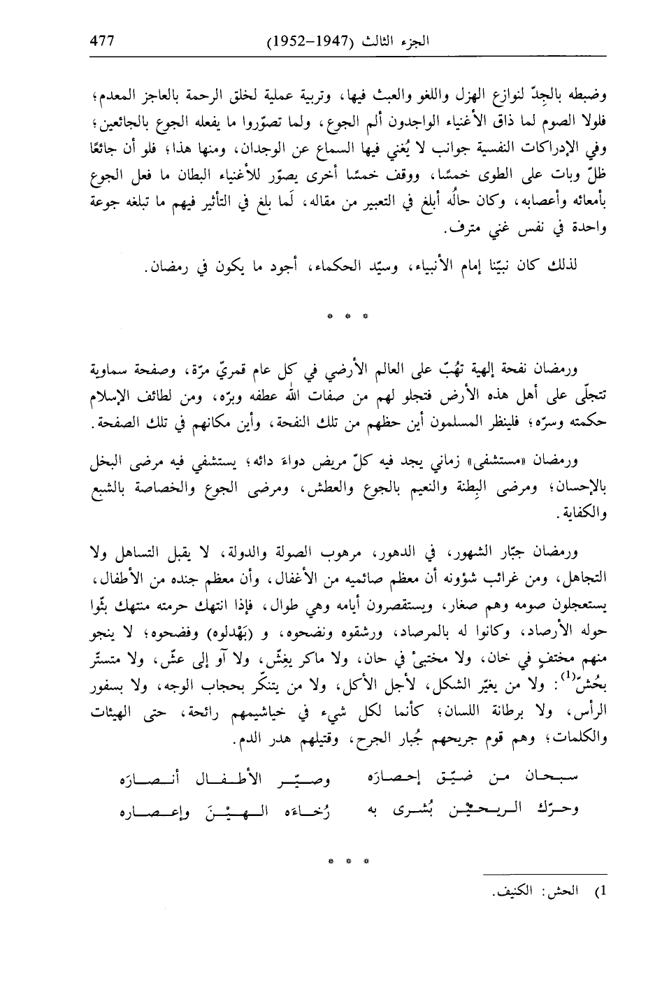 وضبطه بالجِدّ لنوازع الهزل واللغو والعبث فيها، وتربية عملية لخلق الرحمة بالعاجز المعدم، فلولا الصوم لما ذاق الأغنياء الواجدون ألم الجوع، ولما تصوّروا ما يفعله الجوع بالجائعين، وفي الإدراكات النفسية جوانب لا يغني فيها السماع عن الوجدان، ومنها هذا، فلو أن جائعًا ظلّ وبات على الطوى خمسًا، ووقف خمسًا أخرى يصوّر للأغنياء البطان ما فعل الجوع بأمعائه وأعصابه، وكان حالُه أبلغ في التعبير من مقاله، لَما بلغ في التأثير فيهم ما تبلغه جوعة واحدة في نفس غني مترف.