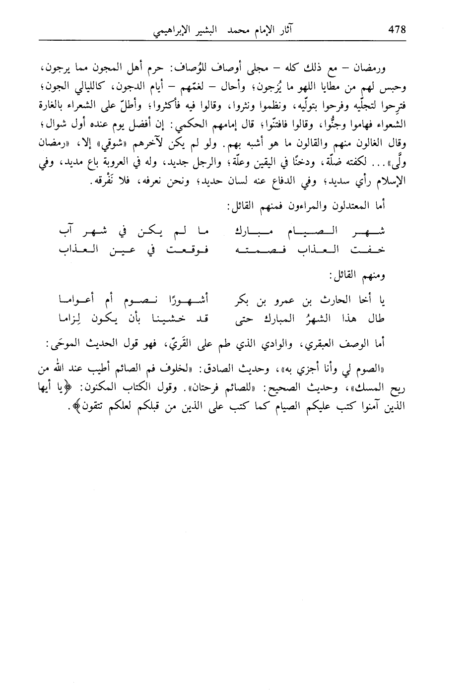 ورمضان- مع ذلك كله- مجلى أوصاف للوُصاف: حرم أهل المجون مما يرجون، وحبس لهم من مطايا اللهو ما يُزجون؛ وأحال- لغمّهم- أيام الدجون، كالليالي الجون؛ فترِحوا لتجلّيه وفرحوا بتولّيه، ونظموا ونثروا، وقالوا فيه فأكثروا، وأطلّ على الشعراء بالغارة الشعواء فهاموا وجنُّوا، وقالوا فافتنّوا، قال إمامهم الحكمي: إن أفضل يوم عنده أول شوال؛ وقال الغالون منهم والقالون ما هو أشبه بهم. ولو لم يكن لآخرهم "شوقي" إلا، "رمضان ولَّى" ... لكفته ضلّة، ودخنًا في اليقين وعلّة، والرجل جديد، وله في العروبة باع مديد، وفي الإسلام رأي سديد؛ وفي الدفاع عنه لسان حديد؛ ونحن نعرفه، فلا نَفْرقه.