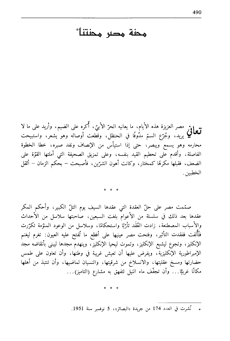 صمّمت مصر على حلّ العقدة التي عقدها السيف يوم التلّ الكبير، وأحكم المكر عقدها بعد ذلك في سلسلة من الأعوام بلغت السبعين، صاحبتها سلاسل من الأحداث والأسباب المصطنعة، زادت العُقَد تأرّبًا واستحكامًا، وسلاسل من الوعود المنوّمة تكرّرت فتُأُلفت ففقدت التأثير، وفتحت مصر عينيها على أفظع ما تُفتح عليه العيون: تغرم ليغنم الإنكليز، وتجوع ليشبع الإنكليز، وتموت ليحيا الإنكليز، وينهدم مجدها ليبنى بأنقاضه مجد الإمبراطورية الإنكليزية، ويفرض عليها أن تعيش غريبة في وطنها، وأن تعاون على طمس حضارتها ومسخ عقليتها، والانسلاخ من شرقيتها، والنسيان لماضيها، وأن تنتبذ من أهلها مكانًا غربيًّا ... وأن تجفّف ماء النيل لتفهق به مشارع (التاميز) ...