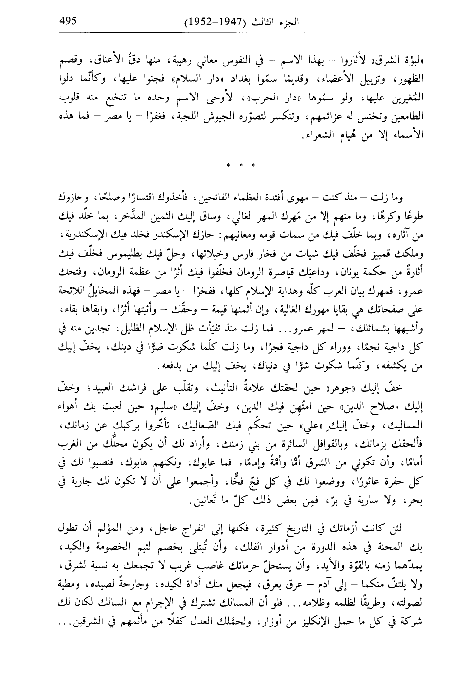 لئن كانت أزماتك في التاريخ كثيرة، فكلها إلى انفراج عاجل، ومن المؤلم أن تطول بك المحنة في هذه الدورة من أدوار الفلك، وأن تُبتلى بخصم لئيم الخصومة والكيد، يمدّهما زمنه بالقوّة والأيد، وأن يستحلّ حرماتك غاصب غريب لا تجمعك به نسبة لشرق، ولا يلتفّ منكما- إلى آدم- عرق بعرق، فيجعل منك أداة لكيده، وجارحةً لصيده، ومطية لصولته، وطريقًا لظلمه وظلامه ... فلو أن المسالك تشترك في الإجرام مع السالك لكان لك شركة في كل ما حمل الإنكليز من أوزار، ولحمَّلك العدل كفلًا من مأثمهم في الشرقين ...