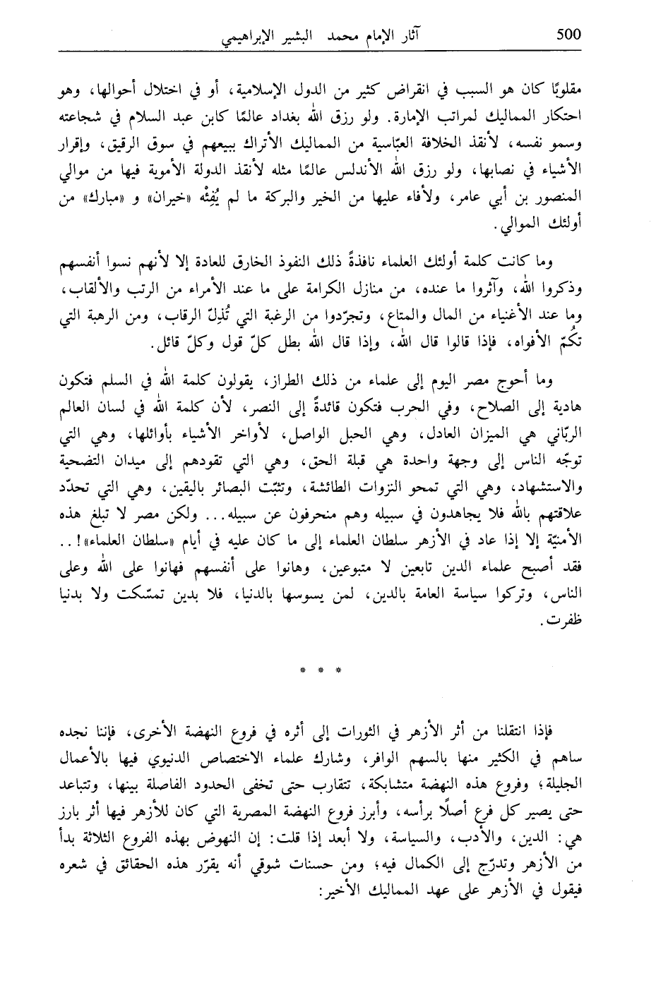 وما كانت كلمة أولئك العلماء نافذةً ذلك النفوذ الخارق للعادة إلا لأنهم نسوا أنفسهم وذكروا الله، وآثروا ما عنده، من منازل الكرامة على ما عند الأمراء من الرتب والألقاب، وما عند الأغنياء من المال والمتاع، وتجرّدوا من الرغبة التي تُذِلّ الرقاب، ومن الرهبة التي تكُمّ الأفواه، فإذا قالوا قال الله، وإذا قال الله بطل كلّ قول وكلّ قائل.
