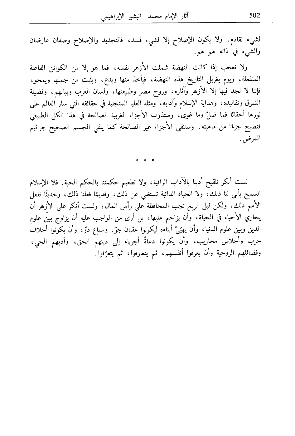 ولا تعجب إذا كانت النهضة شملت الأزهر نفسه، فما هو إلا من الكوائن الفاعلة المنفعلة، ولوم يغربل التاريخ هذه النهضة، فيأخذ منها ويدع، ويثبت من جملها ويمحو، فإننا لا نجد فيها إلا الأزهر وآثاره، وروح مصر وطبيعتها، ولسان العرب وبيانهم، وفضيلة الشرق وتقاليده، وهداية الإسلام وآدابه، ومثله العليا المتجلية في حقائقه التي سار العالم على نورها أحقابًا فما ضلّ وما غوى، وستذوب الأجزاء الغريبة الصالحة في هذا الكل الطبيعي فتصبح جزءًا من ماهيته، وستنفى الأجزاء غير الصالحة كما ينفي الجسم الصحيح جراثيم المرض.