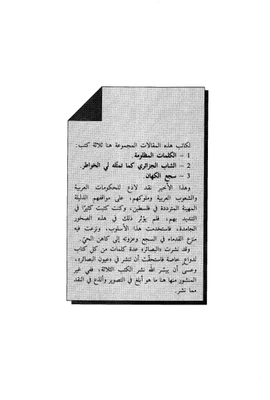 وهذا الأخر نقد لاذع للحكومات العربية والشعوب العربية وملوكهم، على مواقفهم الذليلة المهينة المترددة في فلسطين، وكنت كتبت كثيرًا في التنديد بهم، فلم يؤثر ذلك في هذه الصخور الجامدة، فاستخدمت هذا الأسلوب، ونزعت فيه منزع القدماء في السجع وعزوته إلى كاهن الحيّ.
