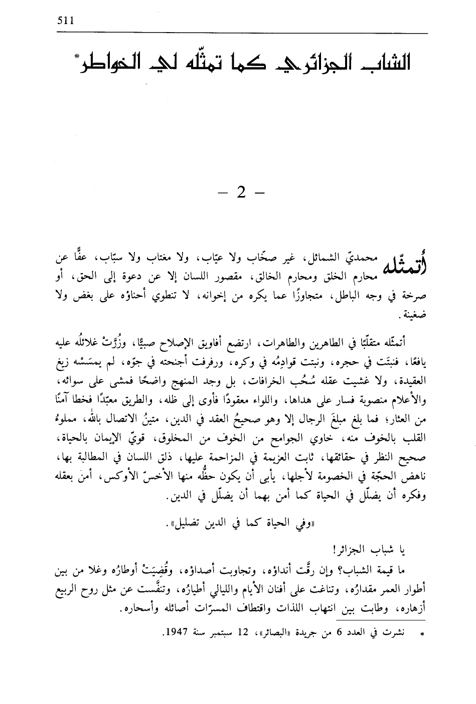 * نشرت في العدد 6 من جريدة «البصائر»، 12 سبتمبر سنة 1947.