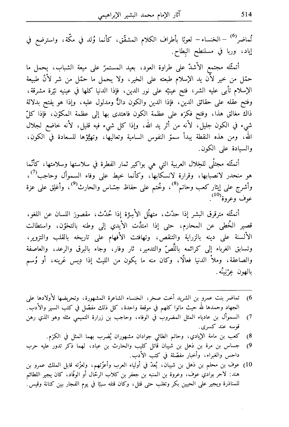 أتمثّله مجتلًى للخِلال العربية التي هي بواكير ثمار الفطرة في سلاستها وسلامتها، كأنّما هو منحدر لانصبابها وقرارة لانسكابها، وكأنما خيط على وفاء السموأل وحاجب (7)، وأشرج على إيثار كعب وحاتم (8)، وخُتم على حفاظ جسّاس والحارث (9)، وأغلِق على عزة عوف وعروة (10).