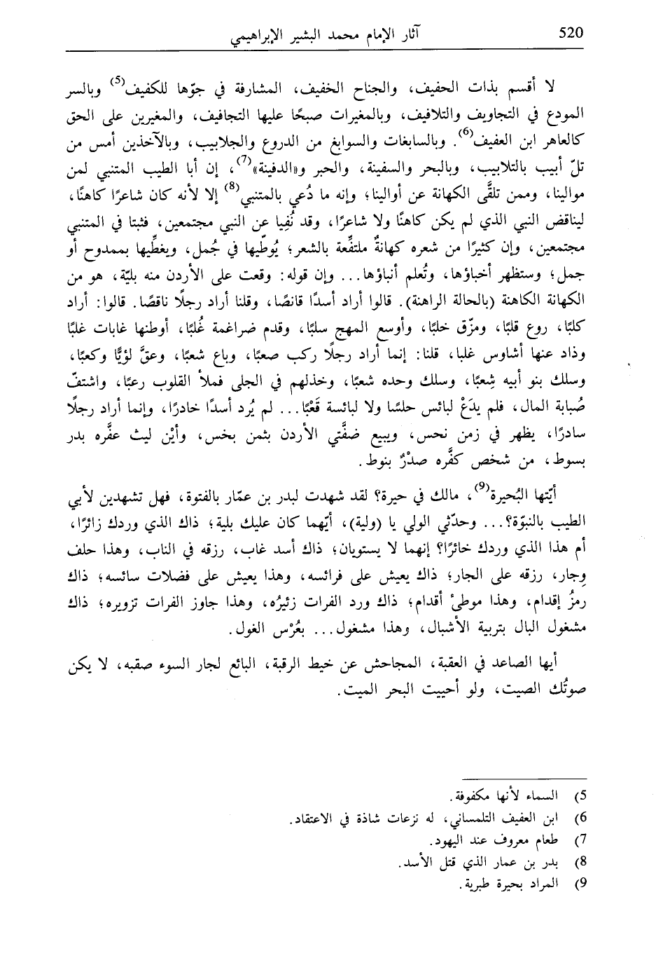 لا أقسم بذات الحفيف، والجناح الخفيف، المشارفة في جوّها للكفيف (5) وبالسر المودع في التجاويف والتلافيف، وبالمغيرات صبحًا عليها التجافيف، والمغيرين على الحق كالعاهر ابن العفيف (6). وبالسابغات والسوابغ من الدروع والجلابيب، وبالآخذين أمس من تلّ أبيب بالتلابيب، وبالبحر والسفينة، والحبر و"الدفينة" (7)، إن أبا الطيب المتنبي لمن موالينا، وممن تلقَّى الكهانة عن أوالينا، وإنه ما دُعي بالمتنبي (8) إلا لأنه كان شاعرًا كاهنًا، ليناقض النبي الذي لم يكن كاهنًا ولا شاعرًا، وقد نُفِيا عن النبي مجتمعين، فثبتا في المتنبي مجتمعين، وإن كثيرًا من شعره كهانةٌ ملتفِّعة بالشعر، يُوطّيها في جُمل، ويغطِّيها بممدوح أو جمل؛ وستظهر أخباؤها، وتُعلم أنباؤها ... وإن قوله: وقعت على الأردن منه بليّة، هو من الكهانة الكاهنة (بالحالة الراهنة). قالوا أراد أسدًا قانصًا، وقلنا أراد رجلًا ناقصًا. قالوا: أراد كلبًا، روع قلبًا، ومزّق خلبًا، وأوسع المهج سلبًا، وقدم ضراغمة غُلبًا، أوطنها غابات غلبًا وذاد عنها أشاوس غلبا، قلنا: إنما أراد رجلًا ركب صعبًا، وباع شعبًا، وعقَّ لؤيًّا وكعبًا، وسلك بنو أبيه شِعبًا، وسلك وحده شعبًا، وخذلهم في الجلى فملأ القلوب رعبًا، واشتفّ صُبابة المال، فلم يدَعْ لبائس حلسًا ولا لبائسة قَعْبًا ... لم يُرد أسدًا خادرًا، وإنما أراد رجلًا سادرًا، يظهر في زمن نحس، ويبيع ضفَّتي الأردن بثمن بخس، وأيْن ليث عفَّره بدر بسوط، من شخص كفَّره صدْرٌ بنوط.