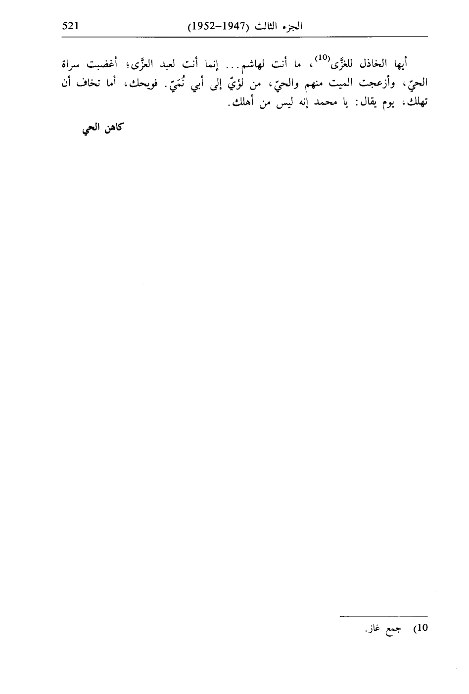 أيها الخاذل للغزَّى (10)، ما أنت لهاشم ... إنما أنت لعبد العزَّى، أغضبت سراة الحيّ، وأزعجت الميت منهم والحيّ، من لؤيّ إلى أبي نُمَيّ. فويحك، أما تخاف أن تهلك، يوم يقال: يا محمد إنه ليس من أهلك.