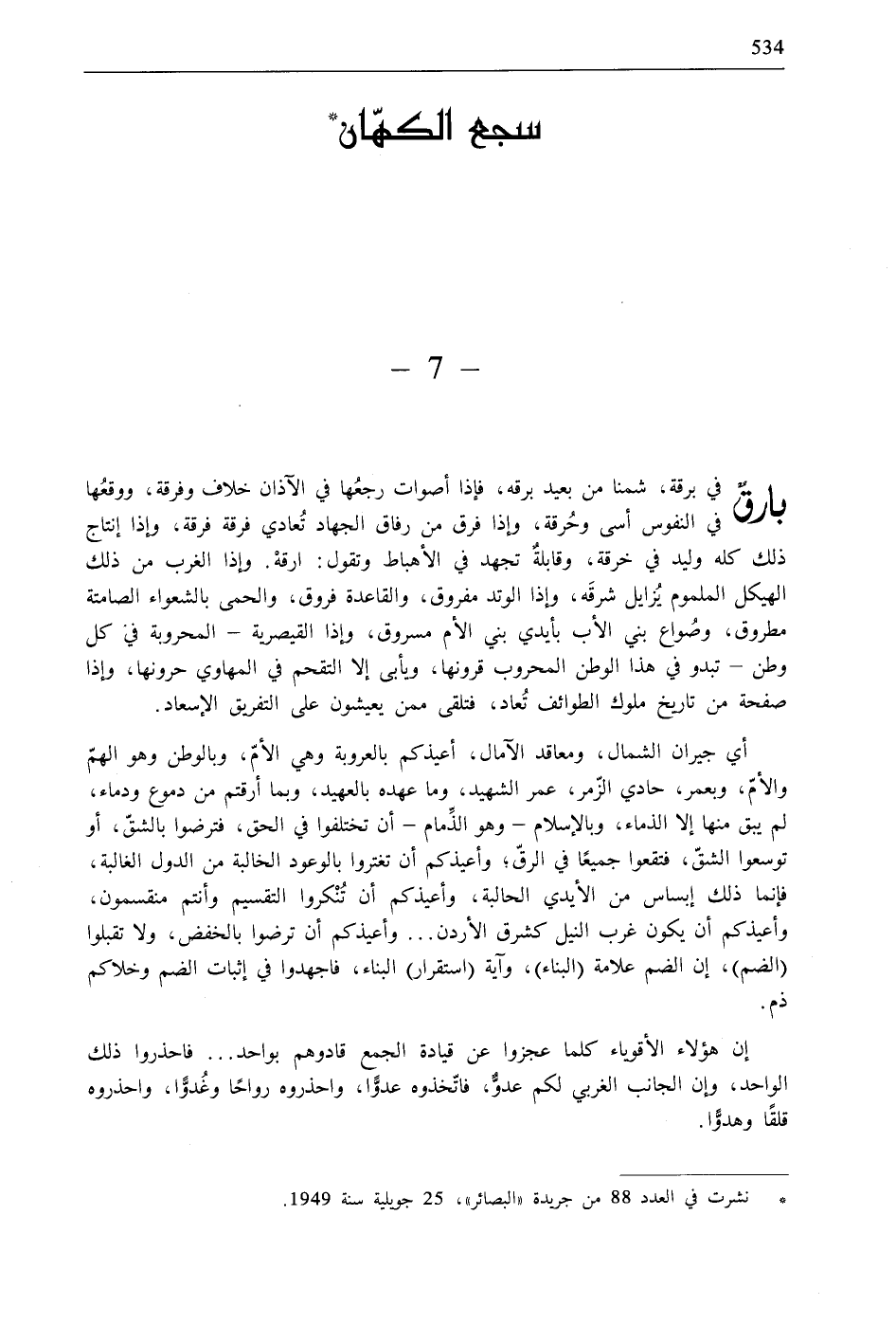 أي جيران الشمال، ومعاقد الآمال، أعيذكم بالعروبة وهي الأمّ، وبالوطن وهو الهمّ والأمّ، وبعمر، حادي الزّمر، عمر الشهيد، وما عهده بالعهيد، وبما أرقتم من دموع ودماء، لم يبق منها إلا الذماء، وبالإسلام- وهو الذِّمام- أن تختلفوا في الحق، فترضوا بالشقّ، أو توسعوا الشقّ، فتقعوا جميعًا في الرقّ، وأعيذكم أن تغتروا بالوعود الخالبة من الدول الغالبة، فإنما ذلك إبساس من الأيدي الحالبة، وأعيذكم أن تُنْكروا التقسيم وأنتم منقسمون، وأعيذكم أن يكون غرب النيل كشرق الأردن ... وأعيذكم أن ترضوا بالخفض، ولا تقبلوا (الضم)، إن الضم علامة (البناء)، وآية (استقرار) البناء، فاجهدوا في إثبات الضم وخلاكم ذم.