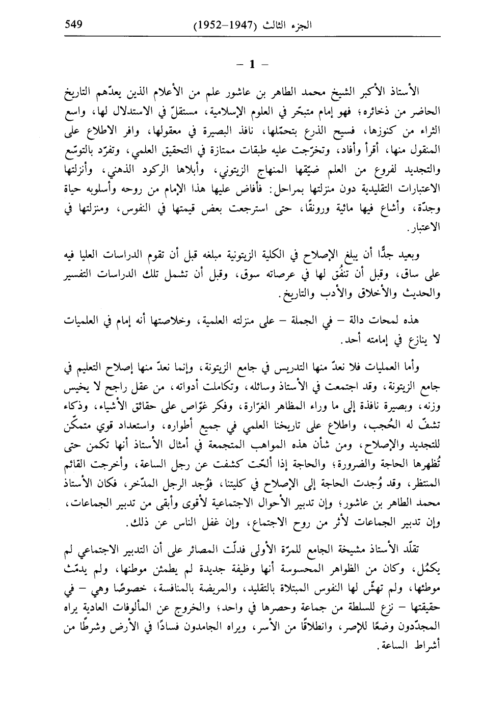 الأستاذ الأكبر الشيخ محمد الطاهر بن عاشور علم من الأعلام الذين يعدّهم التاريخ الحاضر من ذخائره، فهو إمام متبحّر في العلوم الإسلامية، مستقلّ في الاستدلال لها، واسع الثراء من كنوزها، فسيح الذرع بتحمّلها، نافذ البصيرة في معقولها، وافر الاطلاع على المنقول منها، أقرأ وأفاد، وتخرّجت عليه طبقات ممتازة في التحقيق العلمي، وتفرّد بالتوسّع والتجديد لفروع من العلم ضيّقها المنهاج الزيتوني، وأبلاها الركود الذهني، وأنزلتها الاعتبارات التقليدية دون منزلتها بمراحل: فأفاض عليها هذا الإمام من روحه وأسلوبه حياة وجدّة، وأشاع فيها مائية ورونقًا، حتى استرجعت بعض قيمتها في النفوس، ومنزلتها في الاعتبار.